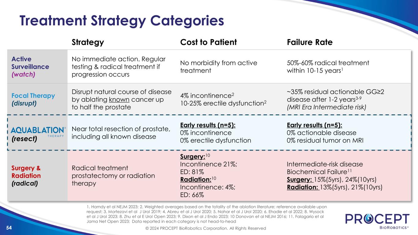53 FDA Prostate Cancer Research PRCT002 Objective Evaluate safety & efficacy of Aquablation therapy for localized prostate cancer. Single-arm FDA IDE Study • Localized prostate cancer • Grade Group 1-2 20 patients PRCT002 Design 5 US Sites © 2024 PROCEPT BioRobotics Corporation. All Rights Reserved