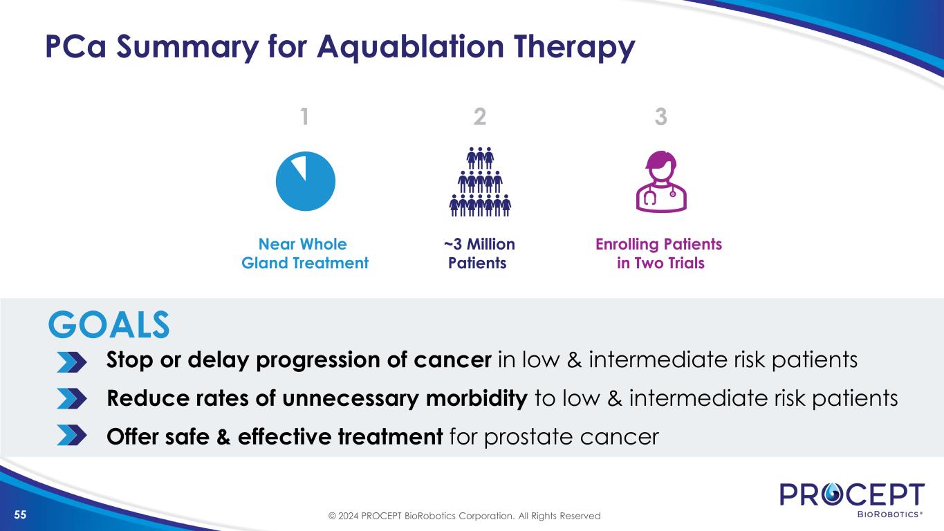 54 Treatment Strategy Categories Strategy Cost to Patient Failure Rate Active Surveillance (watch) No immediate action. Regular testing & radical treatment if progression occurs No morbidity from active treatment 50%-60% radical treatment within 10-15 years1 Focal Therapy (disrupt) Disrupt natural course of disease by ablating known cancer up to half the prostate 4% incontinence2 10-25% erectile dysfunction2 ~35% residual actionable GG≥2 disease after 1-2 years3-9 (MRI Era Intermediate risk) Near total resection of prostate, including all known disease Early results (n=5): 0% incontinence 0% erectile dysfunction Early results (n=5): 0% actionable disease 0% residual tumor on MRI Surgery & Radiation (radical) Radical treatment prostatectomy or radiation therapy Surgery:10 Incontinence 21%; ED: 81% Radiation:10 Incontinence: 4%; ED: 66% Intermediate-risk disease Biochemical Failure11 Surgery: 15%(5yrs), 24%(10yrs) Radiation: 13%(5yrs), 21%(10yrs) 1. Hamdy et al NEJM 2023; 2. Weighted averages based on the totality of the ablation literature; reference available upon request; 3. Mortezavi et al J Urol 2019; 4. Abreu et al J Urol 2020; 5. Nahar et al J Urol 2020; 6. Ehadie et al 2022; 8. Wysock et al J Urol 2023: 8. Zhu et al E Urol Open 2023; 9. Dixon et al J Endo 2023; 10 Donovan et al NEJM 2016; 11. Falagario et al Jama Net Open 2023; (resect) Data reported in each category is not head-to-head © 2024 PROCEPT BioRobotics Corporation. All Rights Reserved