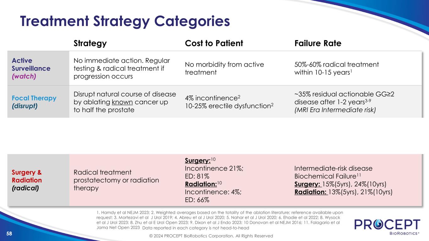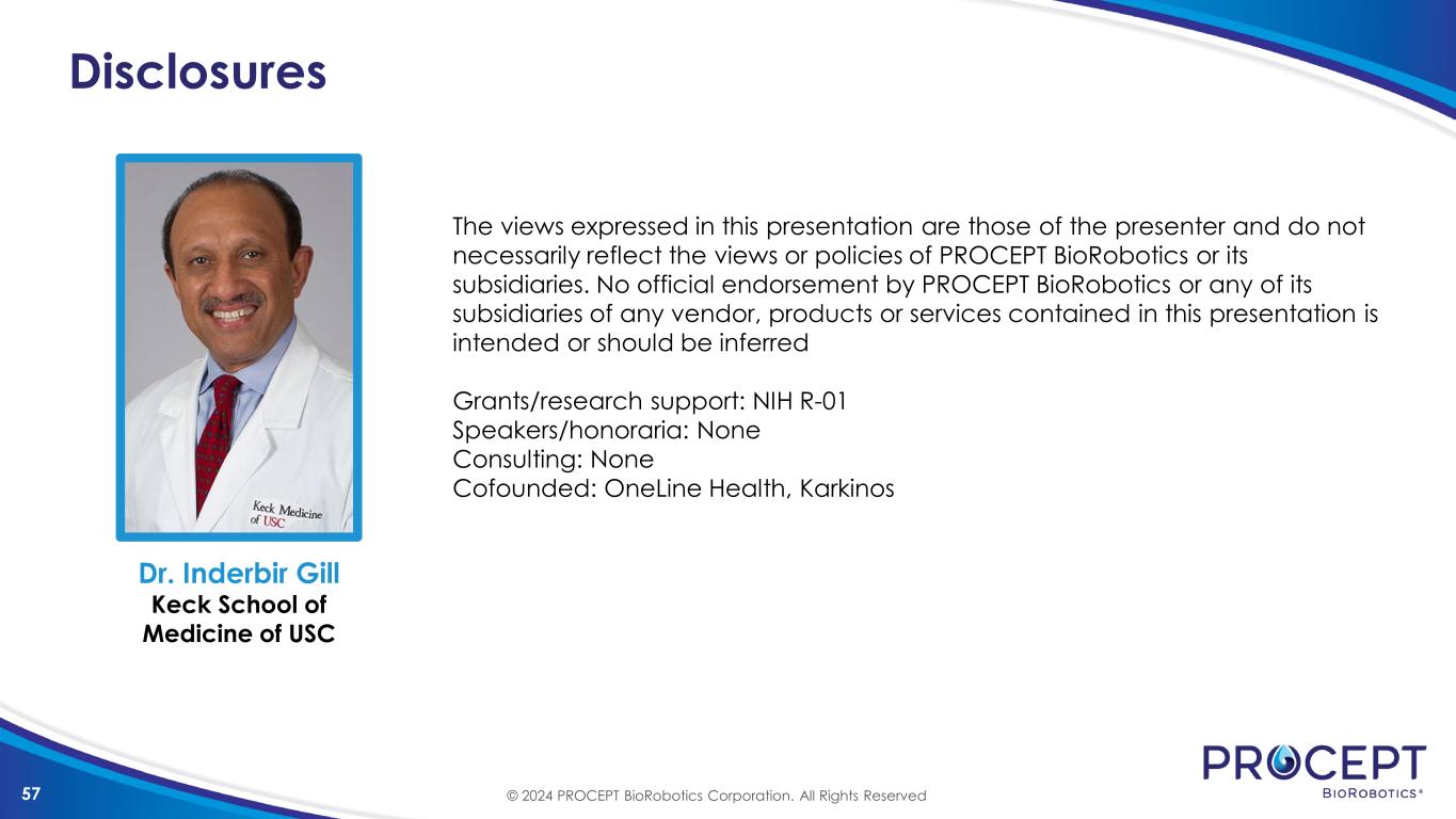 57 Disclosures The views expressed in this presentation are those of the presenter and do not necessarily reflect the views or policies of PROCEPT BioRobotics or its subsidiaries. No official endorsement by PROCEPT BioRobotics or any of its subsidiaries of any vendor, products or services contained in this presentation is intended or should be inferred Grants/research support: NIH R-01 Speakers/honoraria: None Consulting: None Cofounded: OneLine Health, Karkinos Dr. Inderbir Gill Keck School of Medicine of USC © 2024 PROCEPT BioRobotics Corporation. All Rights Reserved