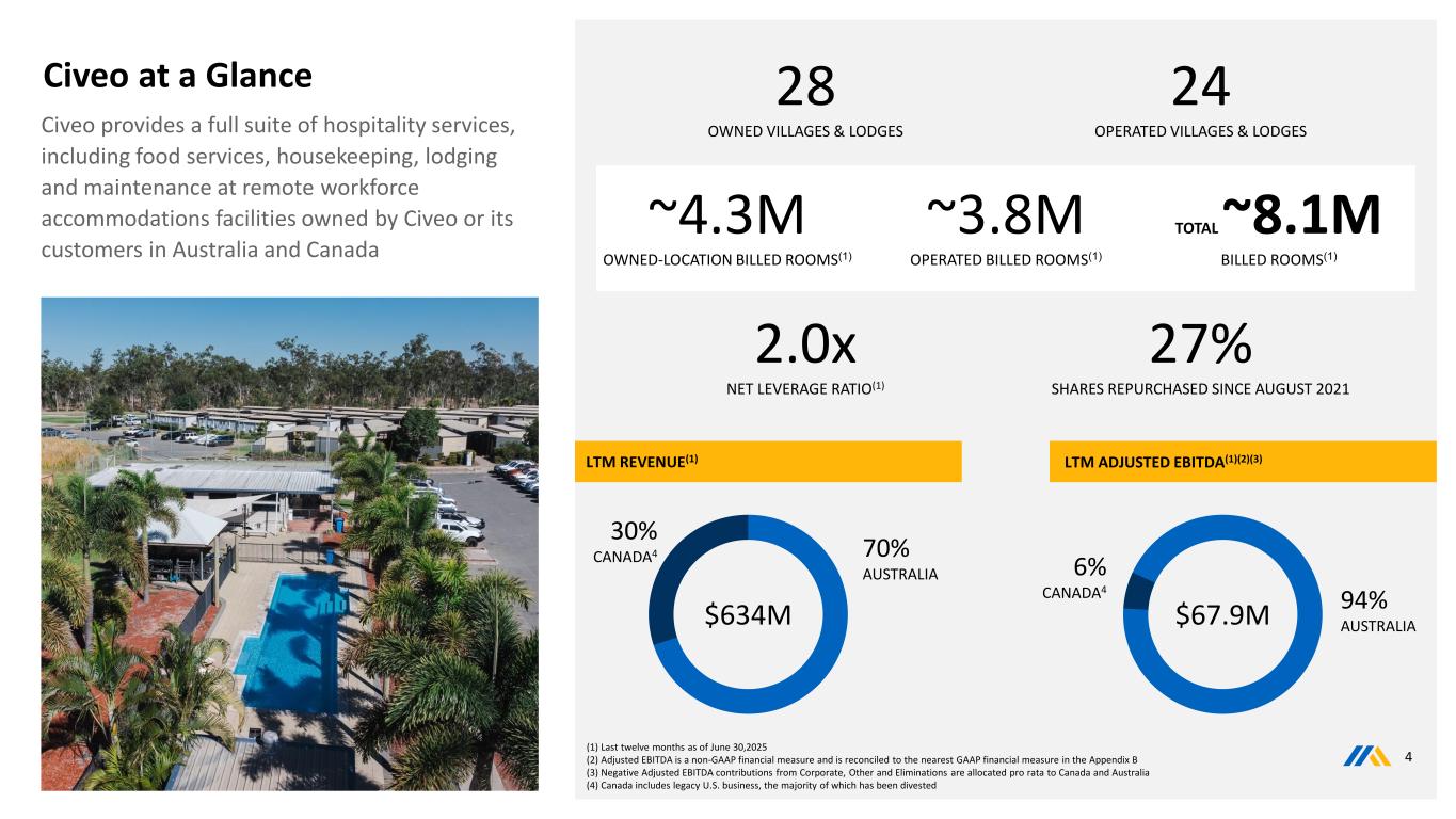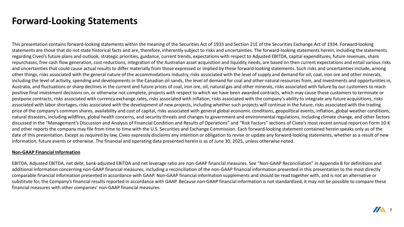 2 Forward-Looking Statements This presentation contains forward-looking statements within the meaning of the Securities Act of 1933 and Section 21E of the Securities Exchange Act of 1934. Forward-looking statements are those that do not state historical facts and are, therefore, inherently subject to risks and uncertainties. The forward-looking statements herein, including the statements regarding Civeo’s future plans and outlook, strategic priorities, guidance, current trends, expectations with respect to Adjusted EBITDA, capital expenditures, future revenues, share repurchases, free cash flow generation, cost reductions, integration of the Australian asset acquisition and liquidity needs, are based on then current expectations and entail various risks and uncertainties that could cause actual results to differ materially from those expressed or implied by these forward-looking statements. Such risks and uncertainties include, among other things, risks associated with the general nature of the accommodations industry, risks associated with the level of supply and demand for oil, coal, iron ore and other minerals, including the level of activity, spending and developments in the Canadian oil sands, the level of demand for coal and other natural resources from, and investments and opportunities in, Australia, and fluctuations or sharp declines in the current and future prices of coal, iron ore, oil, natural gas and other minerals, risks associated with failure by our customers to reach positive final investment decisions on, or otherwise not complete, projects with respect to which we have been awarded contracts, which may cause those customers to terminate or postpone contracts, risks associated with currency exchange rates, risks associated with inflation, risks associated with the company’s ability to integrate any future acquisitions, risks associated with labor shortages, risks associated with the development of new projects, including whether such projects will continue in the future, risks associated with the trading price of the company’s common shares, availability and cost of capital, risks associated with general global economic conditions, geopolitical events, inflation, global weather conditions, natural disasters, including wildfires, global health concerns, and security threats and changes to government and environmental regulations, including climate change, and other factors discussed in the “Management’s Discussion and Analysis of Financial Condition and Results of Operations” and “Risk Factors” sections of Civeo’s most recent annual report on Form 10-K and other reports the company may file from time to time with the U.S. Securities and Exchange Commission. Each forward-looking statement contained herein speaks only as of the date of this presentation. Except as required by law, Civeo expressly disclaims any intention or obligation to revise or update any forward-looking statements, whether as a result of new information, future events or otherwise. The financial and operating data presented herein is as of June 30, 2025, unless otherwise noted. Non-GAAP Financial Information EBITDA, Adjusted EBITDA, net debt, bank-adjusted EBITDA and net leverage ratio are non-GAAP financial measures. See “Non-GAAP Reconciliation” in Appendix B for definitions and additional information concerning non-GAAP financial measures, including a reconciliation of the non-GAAP financial information presented in this presentation to the most directly comparable financial information presented in accordance with GAAP. Non-GAAP financial information supplements and should be read together with, and is not an alternative or substitute for, the Company’s financial results reported in accordance with GAAP. Because non-GAAP financial information is not standardized, it may not be possible to compare these financial measures with other companies’ non-GAAP financial measures.