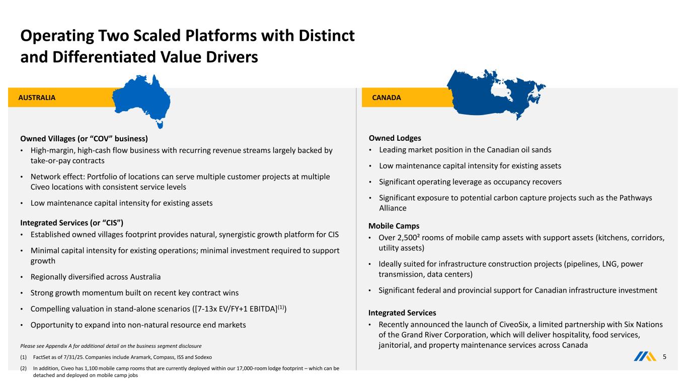 4 28 OWNED VILLAGES & LODGES 24 OPERATED VILLAGES & LODGES 2.0x NET LEVERAGE RATIO(1) 27% SHARES REPURCHASED SINCE AUGUST 2021 Civeo at a Glance Civeo provides a full suite of hospitality services, including food services, housekeeping, lodging and maintenance at remote workforce accommodations facilities owned by Civeo or its customers in Australia and Canada ~4.3M OWNED-LOCATION BILLED ROOMS(1) ~3.8M OPERATED BILLED ROOMS(1) TOTAL ~8.1M BILLED ROOMS(1) 30% CANADA4 70% AUSTRALIA 6% CANADA4 94% AUSTRALIA$634M $67.9M LTM REVENUE(1) LTM ADJUSTED EBITDA(1)(2)(3) (1) Last twelve months as of June 30,2025 (2) Adjusted EBITDA is a non-GAAP financial measure and is reconciled to the nearest GAAP financial measure in the Appendix B (3) Negative Adjusted EBITDA contributions from Corporate, Other and Eliminations are allocated pro rata to Canada and Australia (4) Canada includes legacy U.S. business, the majority of which has been divested