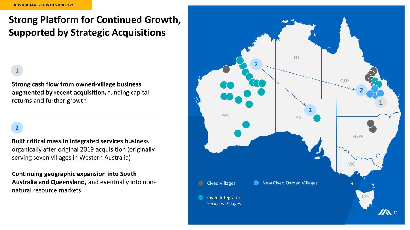 13 Recent Acquisition – Strengthening Position in Core Commodity Market BOWEN BASIN EXPANSION Completed acquisition of four villages (1,368 rooms) in Bowen Basin for A$105M (US$67M) in May 2025 Expands Civeo’s Australian owned-village portfolio in the world’s premier metallurgical coal basin, the Bowen Basin Establishes Civeo in the Blackwater region, extending its unmatched presence and capabilities across the wider Bowen Basin Provides solid footprint with new and existing, metallurgical coal producers under take-or-pay contracts Civeo Villages NT QLD SA NSW VIC TAS WA New Civeo Owned Villages QLD QLD