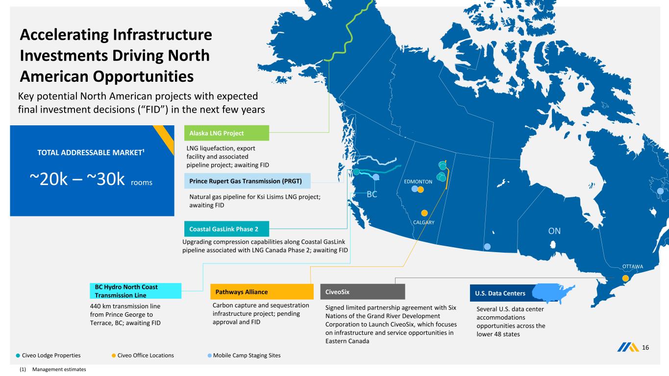 15 Civeo Lodge Properties Civeo Office Locations Mobile Camp Staging Sites Broad Sector and Geographic Exposure in Canada Premier hospitality services, accommodations and infrastructure provider in Canadian oil sands region Serves full lifecycle of a customer’s project by providing: • Permanent lodges for long-term production and operations phases (i.e., operational oil sands) • Mobile and contract camps for initial, construction and exploratory phases (i.e., CGL) • Strong customer relationships and contracts with the top oil sands producers ASSET LIGHT (INTEGRATED SERVICES) Services provided at 1 customer-owned lodge with ~1,000 rooms Served 0.2 million billed rooms in 2024 Owns and operates 16 Civeo-owned lodges with ~17,000 rooms In 2024, served 2.2M billed rooms at Civeo- owned lodges Owns and operates over 2,500¹ mobile camp rooms ~19,500 total rooms ~16,000 rooms serve oil sands industry, ~960 rooms serve natural gas development and ~2,500 mobile camp rooms serve both natural gas and infrastructure development projects ASSET INTENSIVE (ACCOMMODATIONS AND INFRASTRUCTURE) (1) In addition, Civeo has 1,100 mobile camp rooms that are currently deployed within our 17,000-room lodge footprint – which can be detached and deployed on mobile camp jobs