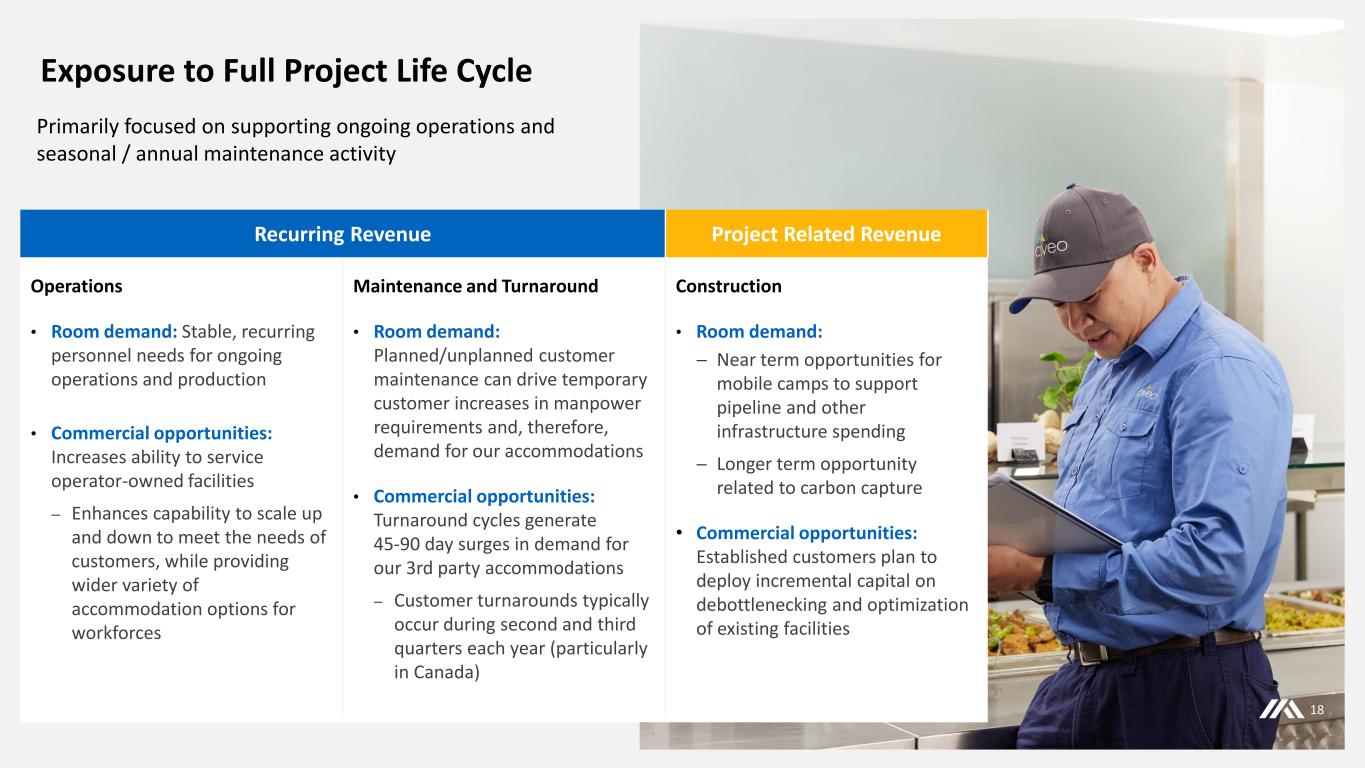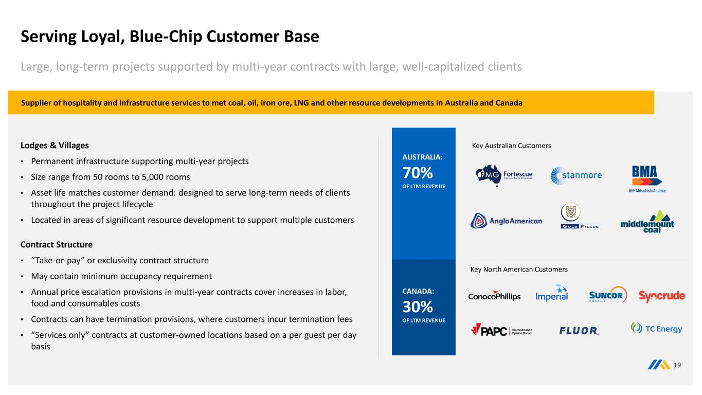18 Exposure to Full Project Life Cycle Recurring Revenue Project Related Revenue Operations Maintenance and Turnaround Construction • Room demand: Stable, recurring personnel needs for ongoing operations and production • Commercial opportunities: Increases ability to service operator-owned facilities − Enhances capability to scale up and down to meet the needs of customers, while providing wider variety of accommodation options for workforces • Room demand: Planned/unplanned customer maintenance can drive temporary customer increases in manpower requirements and, therefore, demand for our accommodations • Commercial opportunities: Turnaround cycles generate 45-90 day surges in demand for our 3rd party accommodations − Customer turnarounds typically occur during second and third quarters each year (particularly in Canada) • Room demand: − Near term opportunities for mobile camps to support pipeline and other infrastructure spending − Longer term opportunity related to carbon capture • Commercial opportunities: Established customers plan to deploy incremental capital on debottlenecking and optimization of existing facilities Primarily focused on supporting ongoing operations and seasonal / annual maintenance activity