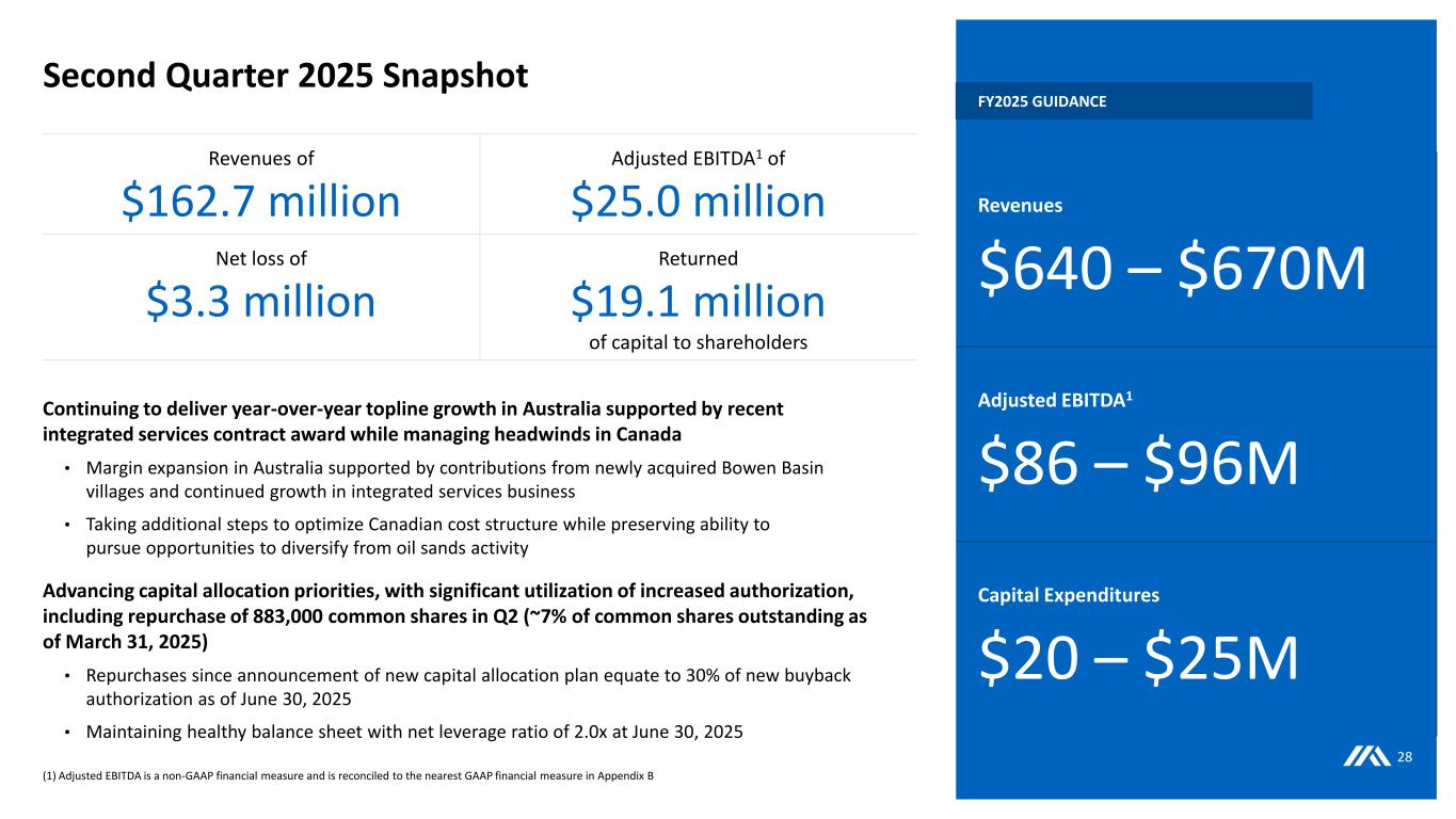 28 Second Quarter 2025 Snapshot (1) Adjusted EBITDA is a non-GAAP financial measure and is reconciled to the nearest GAAP financial measure in Appendix B FY2025 GUIDANCE Revenues $640 – $670M Adjusted EBITDA1 $86 – $96M Capital Expenditures $20 – $25M Revenues of $162.7 million Adjusted EBITDA1 of $25.0 million Net loss of $3.3 million Returned $19.1 million of capital to shareholders Continuing to deliver year-over-year topline growth in Australia supported by recent integrated services contract award while managing headwinds in Canada • Margin expansion in Australia supported by contributions from newly acquired Bowen Basin villages and continued growth in integrated services business • Taking additional steps to optimize Canadian cost structure while preserving ability to pursue opportunities to diversify from oil sands activity Advancing capital allocation priorities, with significant utilization of increased authorization, including repurchase of 883,000 common shares in Q2 (~7% of common shares outstanding as of March 31, 2025) • Repurchases since announcement of new capital allocation plan equate to 30% of new buyback authorization as of June 30, 2025 • Maintaining healthy balance sheet with net leverage ratio of 2.0x at June 30, 2025
