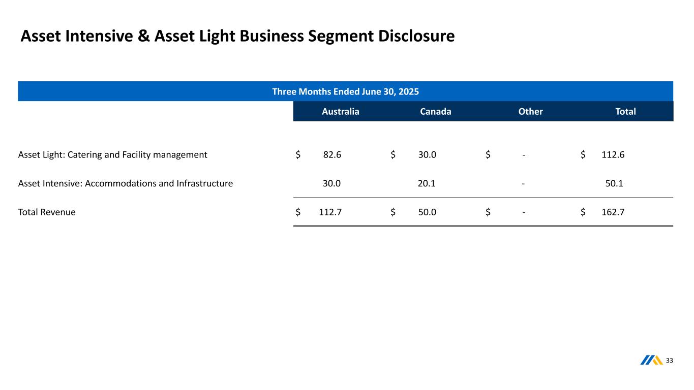 33 Asset Intensive & Asset Light Business Segment Disclosure Three Months Ended June 30, 2025 Australia Canada Other Total Asset Light: Catering and Facility management $ 82.6 $ 30.0 $ - $ 112.6 Asset Intensive: Accommodations and Infrastructure 30.0 20.1 - 50.1 Total Revenue $ 112.7 $ 50.0 $ - $ 162.7