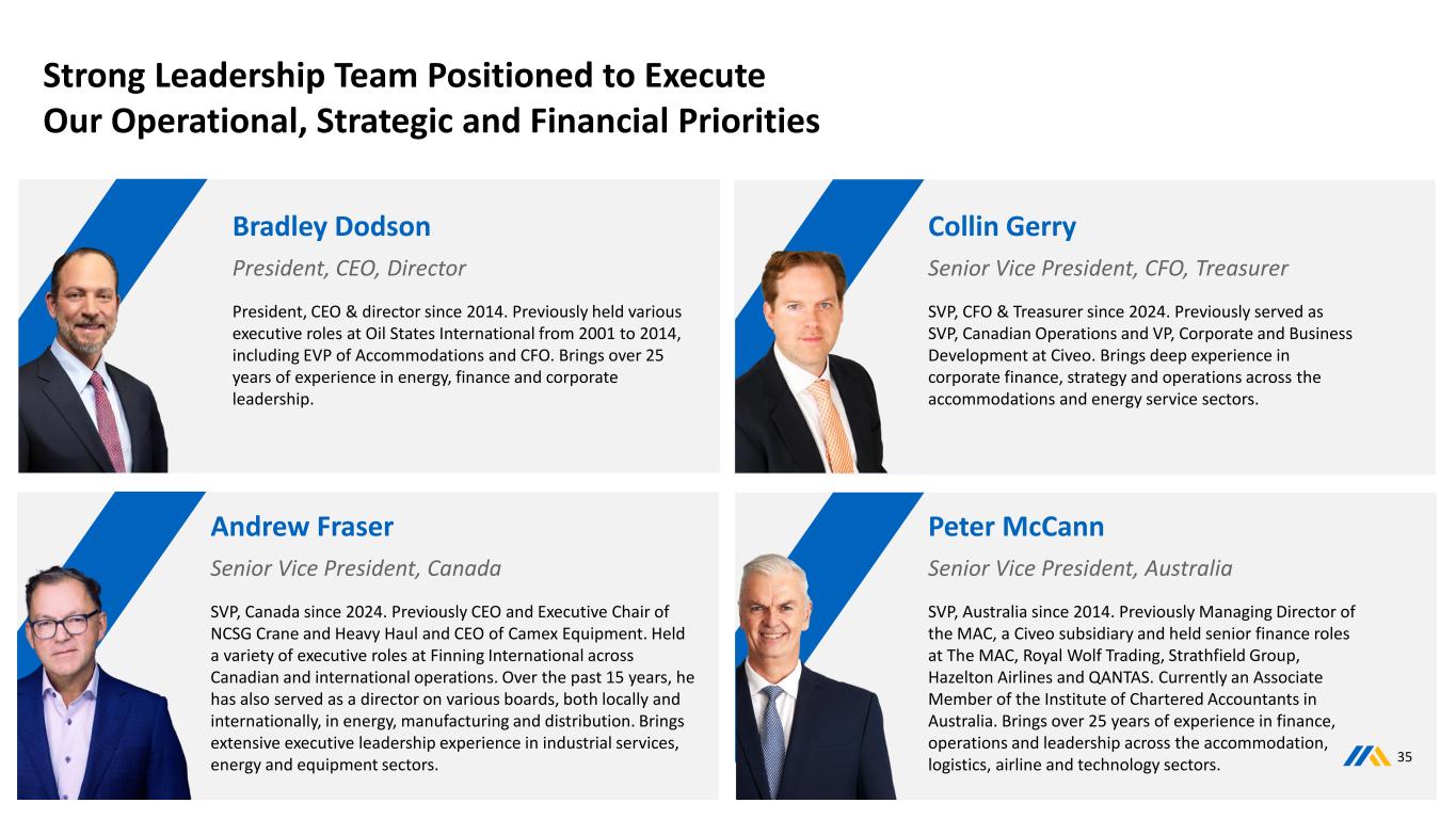 35 Peter McCann Senior Vice President, Australia SVP, Australia since 2014. Previously Managing Director of the MAC, a Civeo subsidiary and held senior finance roles at The MAC, Royal Wolf Trading, Strathfield Group, Hazelton Airlines and QANTAS. Currently an Associate Member of the Institute of Chartered Accountants in Australia. Brings over 25 years of experience in finance, operations and leadership across the accommodation, logistics, airline and technology sectors. Strong Leadership Team Positioned to Execute Our Operational, Strategic and Financial Priorities Bradley Dodson President, CEO, Director President, CEO & director since 2014. Previously held various executive roles at Oil States International from 2001 to 2014, including EVP of Accommodations and CFO. Brings over 25 years of experience in energy, finance and corporate leadership. Andrew Fraser Senior Vice President, Canada SVP, Canada since 2024. Previously CEO and Executive Chair of NCSG Crane and Heavy Haul and CEO of Camex Equipment. Held a variety of executive roles at Finning International across Canadian and international operations. Over the past 15 years, he has also served as a director on various boards, both locally and internationally, in energy, manufacturing and distribution. Brings extensive executive leadership experience in industrial services, energy and equipment sectors. Collin Gerry Senior Vice President, CFO, Treasurer SVP, CFO & Treasurer since 2024. Previously served as SVP, Canadian Operations and VP, Corporate and Business Development at Civeo. Brings deep experience in corporate finance, strategy and operations across the accommodations and energy service sectors.