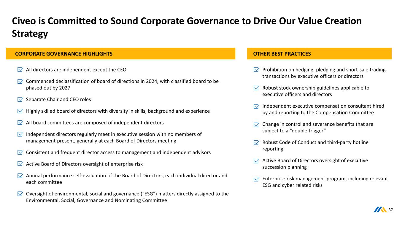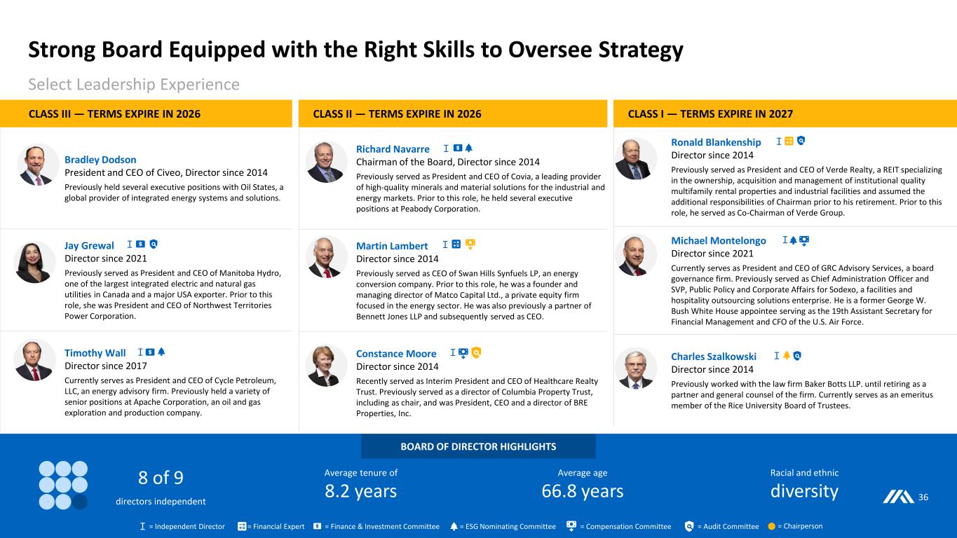 36 Ronald Blankenship Director since 2014 Previously served as President and CEO of Verde Realty, a REIT specializing in the ownership, acquisition and management of institutional quality multifamily rental properties and industrial facilities and assumed the additional responsibilities of Chairman prior to his retirement. Prior to this role, he served as Co-Chairman of Verde Group. Michael Montelongo Director since 2021 Currently serves as President and CEO of GRC Advisory Services, a board governance firm. Previously served as Chief Administration Officer and SVP, Public Policy and Corporate Affairs for Sodexo, a facilities and hospitality outsourcing solutions enterprise. He is a former George W. Bush White House appointee serving as the 19th Assistant Secretary for Financial Management and CFO of the U.S. Air Force. Charles Szalkowski Director since 2014 Previously worked with the law firm Baker Botts LLP. until retiring as a partner and general counsel of the firm. Currently serves as an emeritus member of the Rice University Board of Trustees. Strong Board Equipped with the Right Skills to Oversee Strategy CLASS III — TERMS EXPIRE IN 2026 CLASS II — TERMS EXPIRE IN 2026 CLASS I — TERMS EXPIRE IN 2027 Bradley Dodson President and CEO of Civeo, Director since 2014 Previously held several executive positions with Oil States, a global provider of integrated energy systems and solutions. Jay Grewal Director since 2021 Previously served as President and CEO of Manitoba Hydro, one of the largest integrated electric and natural gas utilities in Canada and a major USA exporter. Prior to this role, she was President and CEO of Northwest Territories Power Corporation. Timothy Wall Director since 2017 Currently serves as President and CEO of Cycle Petroleum, LLC, an energy advisory firm. Previously held a variety of senior positions at Apache Corporation, an oil and gas exploration and production company. Richard Navarre Chairman of the Board, Director since 2014 Previously served as President and CEO of Covia, a leading provider of high-quality minerals and material solutions for the industrial and energy markets. Prior to this role, he held several executive positions at Peabody Corporation. Martin Lambert Director since 2014 Previously served as CEO of Swan Hills Synfuels LP, an energy conversion company. Prior to this role, he was a founder and managing director of Matco Capital Ltd., a private equity firm focused in the energy sector. He was also previously a partner of Bennett Jones LLP and subsequently served as CEO. Constance Moore Director since 2014 Recently served as Interim President and CEO of Healthcare Realty Trust. Previously served as a director of Columbia Property Trust, including as chair, and was President, CEO and a director of BRE Properties, Inc. • Average tenure of 8.2 years • Average age 66.8 years • Racial and ethnic diversity BOARD OF DIRECTOR HIGHLIGHTS 8 of 9 directors independent Select Leadership Experience = Independent Director = Financial Expert = Finance & Investment Committee = ESG Nominating Committee = Compensation Committee = Audit Committee = Chairperson