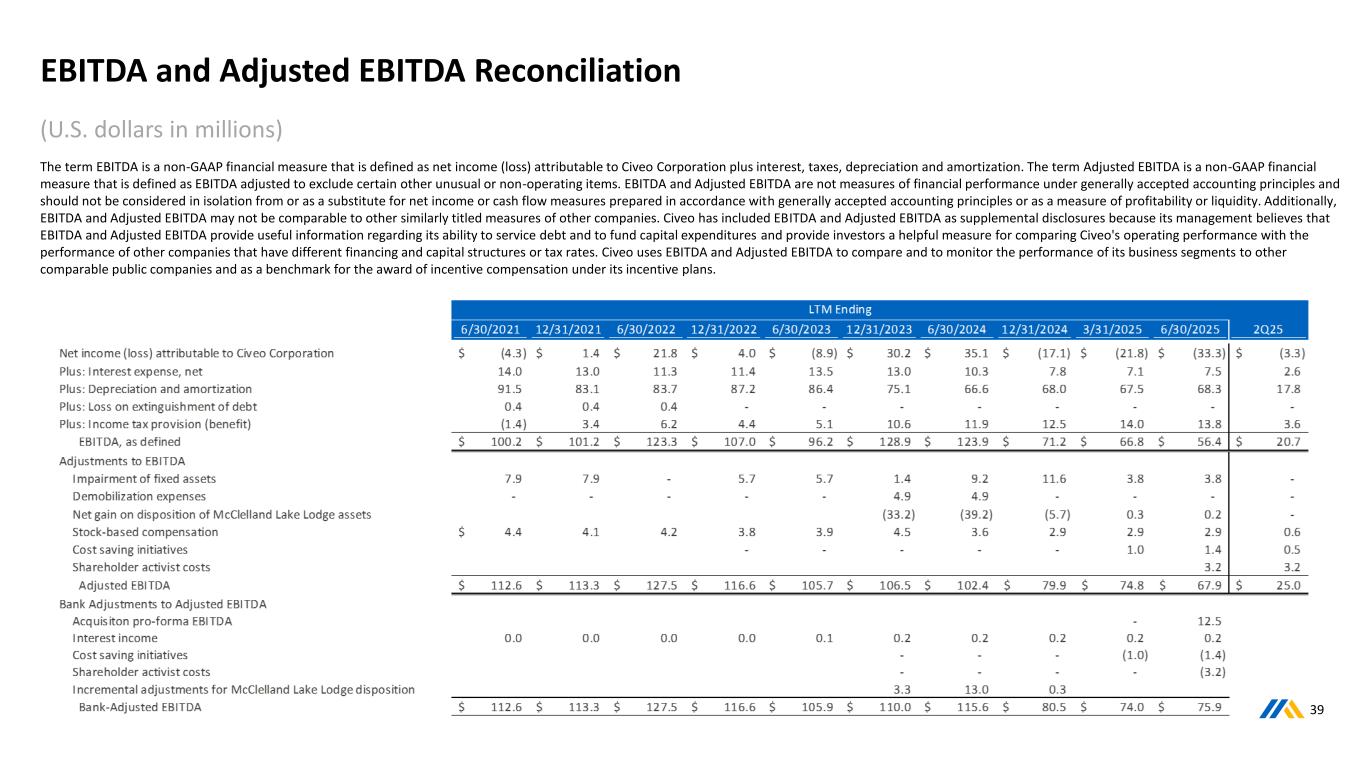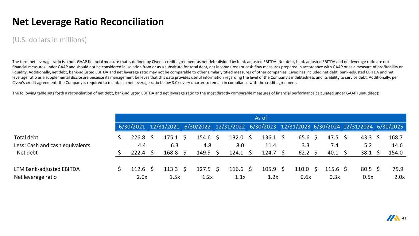 41 Net Leverage Ratio Reconciliation (U.S. dollars in millions) The term net leverage ratio is a non-GAAP financial measure that is defined by Civeo's credit agreement as net debt divided by bank-adjusted EBITDA. Net debt, bank-adjusted EBITDA and net leverage ratio are not financial measures under GAAP and should not be considered in isolation from or as a substitute for total debt, net income (loss) or cash flow measures prepared in accordance with GAAP or as a measure of profitability or liquidity. Additionally, net debt, bank-adjusted EBITDA and net leverage ratio may not be comparable to other similarly titled measures of other companies. Civeo has included net debt, bank-adjusted EBITDA and net leverage ratio as a supplemental disclosure because its management believes that this data provides useful information regarding the level of the Company’s indebtedness and its ability to service debt. Additionally, per Civeo’s credit agreement, the Company is required to maintain a net leverage ratio below 3.0x every quarter to remain in compliance with the credit agreement. The following table sets forth a reconciliation of net debt, bank-adjusted EBITDA and net leverage ratio to the most directly comparable measures of financial performance calculated under GAAP (unaudited): As of 6/30/2021 12/31/2021 6/30/2022 12/31/2022 6/30/2023 12/31/2023 6/30/2024 12/31/2024 6/30/2025 Total debt $ 226.8 $ 175.1 $ 154.6 $ 132.0 $ 136.1 $ 65.6 $ 47.5 $ 43.3 $ 168.7 Less: Cash and cash equivalents 4.4 6.3 4.8 8.0 11.4 3.3 7.4 5.2 14.6 Net debt $ 222.4 $ 168.8 $ 149.9 $ 124.1 $ 124.7 $ 62.2 $ 40.1 $ 38.1 $ 154.0 LTM Bank-adjusted EBITDA $ 112.6 $ 113.3 $ 127.5 $ 116.6 $ 105.9 $ 110.0 $ 115.6 $ 80.5 $ 75.9 Net leverage ratio 2.0x 1.5x 1.2x 1.1x 1.2x 0.6x 0.3x 0.5x 2.0x