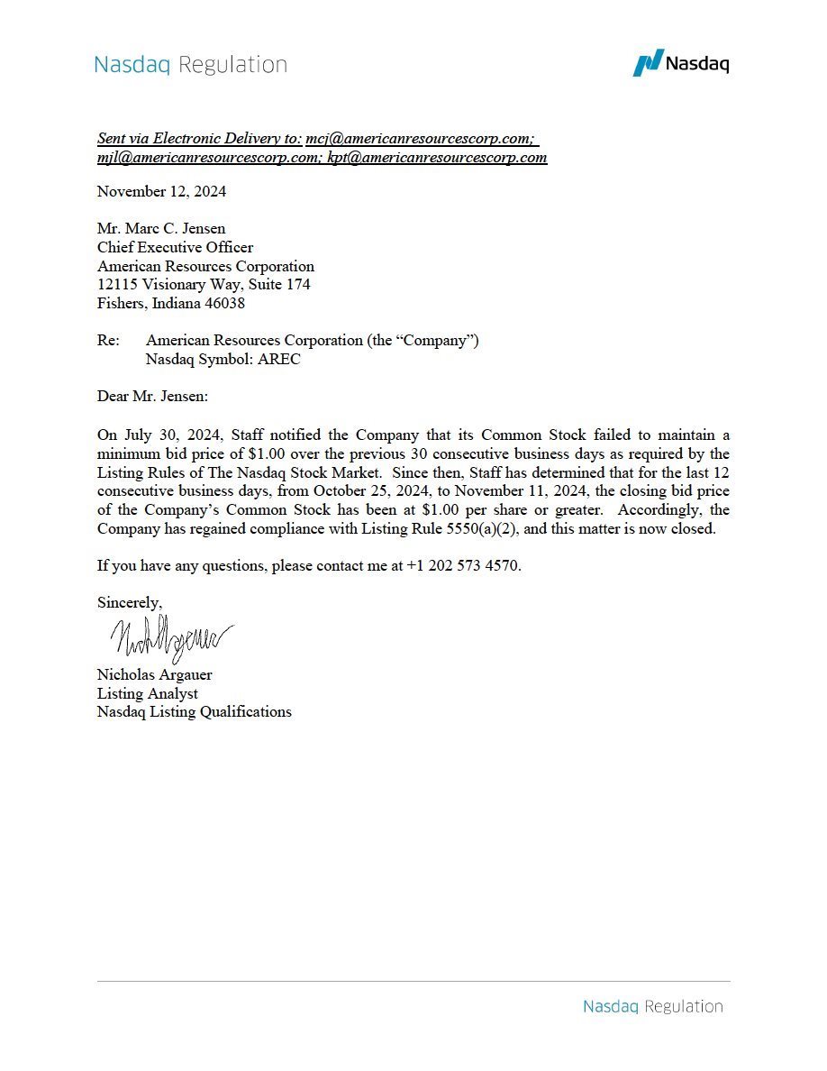 EX-99.1 2 arec_ex991.htm NOTIFICATION LETTER arec_ex991.htm
