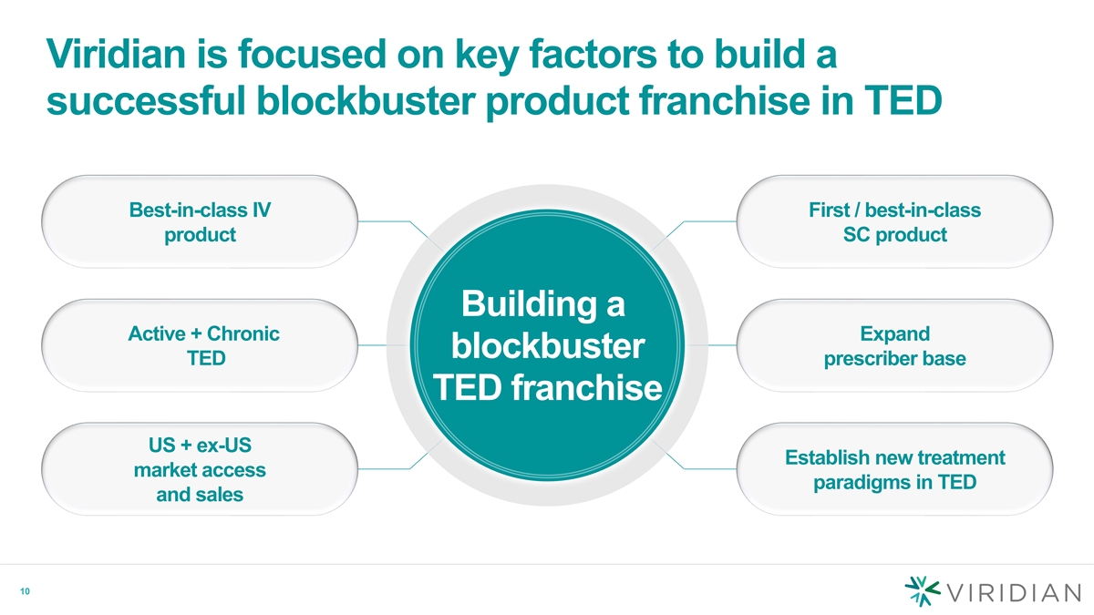 Large commercial opportunity in US and Europe Active TED Chronic TED moderate to severe moderate to severe $4B+ Approved 2020 20-40% ~10% ~$2B (2022) 0% 0% Not approved Estimated Tepezza market share Annual US sales 2 years Estimated annual peak following first product approval sales opportunity Source: Horizon Therapeutics 4Q/FY22 & 3Q 22 earnings: peak US annual net sales of >$3B and ex-U.S. estimate of >$1B peak annual net sales; 9 Viridian-sponsored market research
