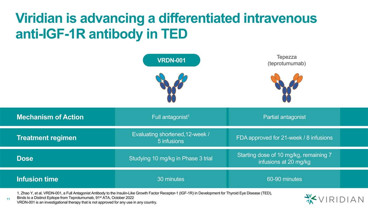 Viridian is focused on key factors to build a successful blockbuster product franchise in TED Best-in-class IV First / best-in-class product SC product Building a Active + Chronic Expand blockbuster TED prescriber base TED franchise US + ex-US Establish new treatment market access paradigms in TED and sales 10