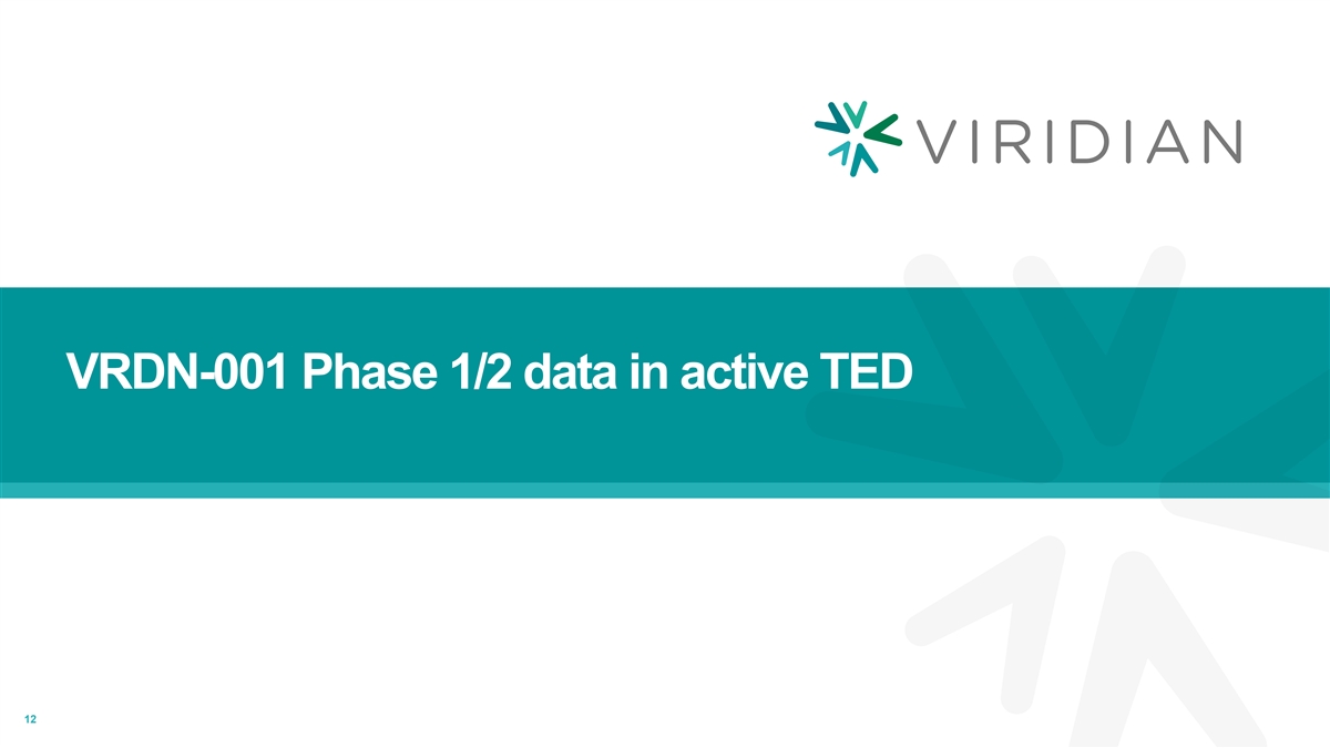 Viridian is advancing a differentiated intravenous anti-IGF-1R antibody in TED Tepezza VRDN-001 (teprotumumab) 1 Full antagonist Partial antagonist Mechanism of Action Evaluating shortened,12-week / FDA approved for 21-week / 8 infusions Treatment regimen 5 infusions Starting dose of 10 mg/kg, remaining 7 Studying 10 mg/kg in Phase 3 trial Dose infusions at 20 mg/kg 30 minutes 60-90 minutes Infusion time 1. Zhao Y, et al. VRDN-001, a Full Antagonist Antibody to the Insulin-Like Growth Factor Receptor-1 (IGF-1R) in Development for Thyroid Eye Disease (TED), st Binds to a Distinct Epitope from Teprotumumab, 91 ATA, October 2022 11 VRDN-001 is an investigational therapy that is not approved for any use in any country.