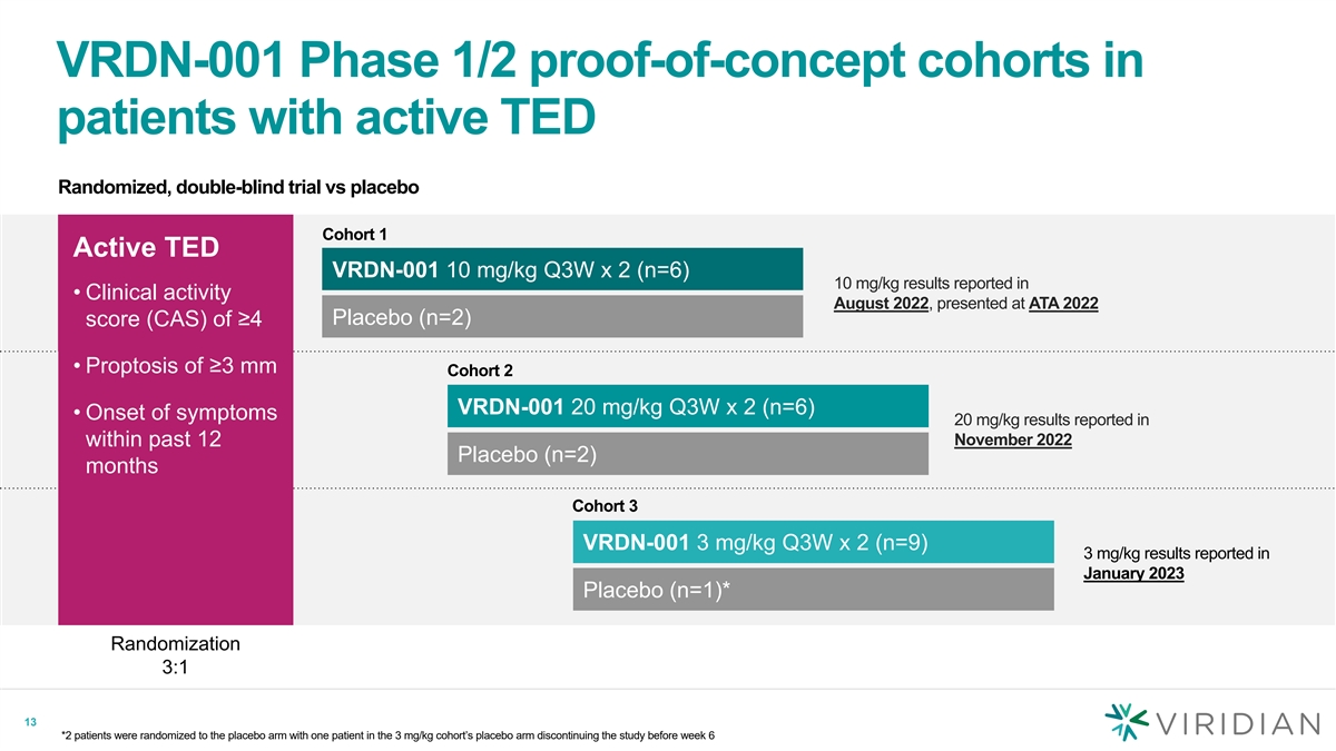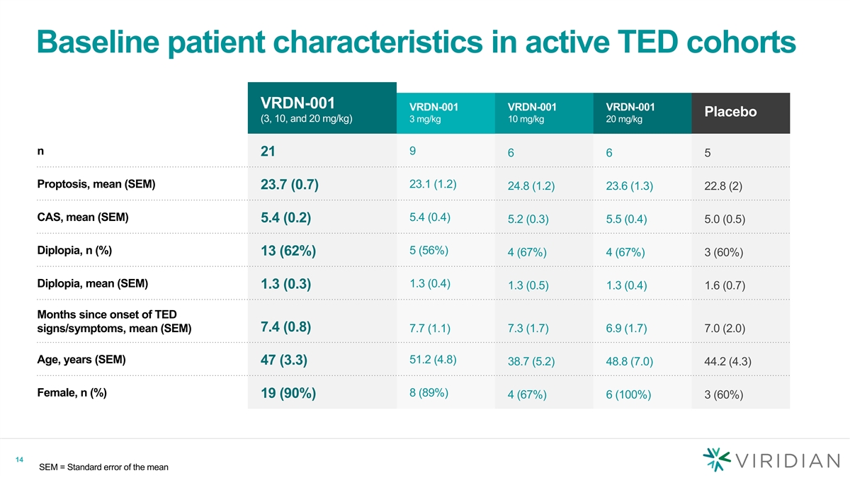 VRDN-001 Phase 1/2 proof-of-concept cohorts in patients with active TED Randomized, double-blind trial vs placebo Cohort 1 Active TED VRDN-001 10 mg/kg Q3W x 2 (n=6) 10 mg/kg results reported in • Clinical activity August 2022, presented at ATA 2022 Placebo (n=2) score (CAS) of ≥4 • Proptosis of ≥3 mm Cohort 2 VRDN-001 20 mg/kg Q3W x 2 (n=6) • Onset of symptoms 20 mg/kg results reported in November 2022 within past 12 Placebo (n=2) months Cohort 3 VRDN-001 3 mg/kg Q3W x 2 (n=9) 3 mg/kg results reported in January 2023 Placebo (n=1)* Randomization 3:1 13 *2 patients were randomized to the placebo arm with one patient in the 3 mg/kg cohort’s placebo arm discontinuing the study before week 6