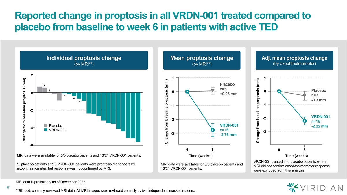 Clinical activity observed at week 6 at all doses consistent with full target engagement in patients with active TED Individual proptosis change Individual CAS change TED IGF-1 (by exophthalmometer) (All Patients) 0 0 VRDN-001 3 mg/kg* n=5 0 VRDN-001 10 mg/kg n=6 8 VRDN-001 20 mg/kg n=6 Placebo n=5 -2 6 -2 -4 4 -4 -6 2 VRDN 3 mg/kg VRDN 3 mg/kg VRDN 10 mg/kg VRDN 10 mg/kg VRDN 20 mg/kg VRDN 20 mg/kg -8 0 -6 0 3 6 Time (weeks) IGF-1 data presented as mean ± SEM 16 *Preliminary 3 mg/kg plasma IGF-1 levels include n=5 at week 6 and n=9 at week 3 Change from baseline proptosis (mm) CAS change Plasma IGF-1 levels (fold above baseline)