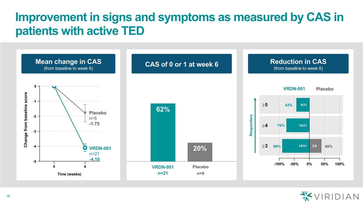 Improvement in signs and symptoms as measured by CAS in patients with active TED Mean change in CAS Reduction in CAS CAS of 0 or 1 at week 6 (from baseline to week 6) (from baseline to week 6) 0 VRDN-001 Placebo -1 9/21 ≥5 43% 62% 62% Placebo -2 n=5 -1.75 16/21 76% ≥4 -3 19/21 2/5 -4≥3 90% 40% VRDN-001 20% 20% n=21 -4.10 -5 -100% -50% 0% 50% 100% 0 6 Placebo VRDN-001 n=21 n=5 Time (weeks) 18 Change from baseline score Responders