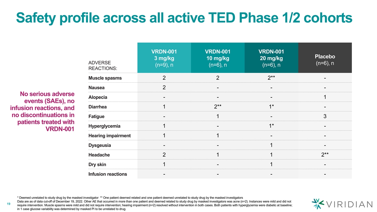 Safety profile across all active TED Phase 1/2 cohorts VRDN-001 VRDN-001 VRDN-001 Placebo 3 mg/kg 10 mg/kg 20 mg/kg ADVERSE (n=6), n (n=9), n (n=6), n (n=6), n REACTIONS: Muscle spasms 2 2 2** - Nausea 2 - - - No serious adverse Alopecia - - - 1 events (SAEs), no Diarrhea 1 2** 1* - infusion reactions, and no discontinuations in Fatigue - 1 - 3 patients treated with Hyperglycemia 1 - 1* - VRDN-001 Hearing impairment 1 1 - - Dysgeusia - - 1 - Headache 2 1 1 2** Dry skin 1 - 1 - Infusion reactions - - - - * Deemed unrelated to study drug by the masked investigator ** One patient deemed related and one patient deemed unrelated to study drug by the masked investigators Data are as of data cut-off of December 19, 2022. Other AE that occurred in more than one patient and deemed related to study drug by masked investigators was acne (n=2). Instances were mild and did not 19 require intervention. Muscle spasms were mild and did not require intervention; hearing impairment (n=2) resolved without intervention in both cases. Both patients with hyperglycemia were diabetic at baseline; in 1 case glucose variability was determined by masked PI to be unrelated to drug.