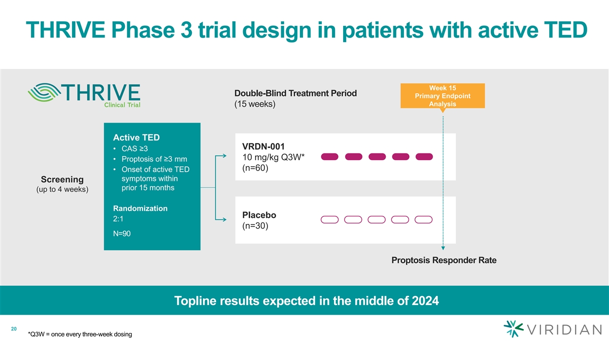 THRIVE Phase 3 trial design in patients with active TED Week 15 Double-Blind Treatment Period Primary Endpoint Analysis (15 weeks) Active TED VRDN-001 • CAS ≥3 10 mg/kg Q3W* • Proptosis of ≥3 mm (n=60) • Onset of active TED symptoms within Screening prior 15 months (up to 4 weeks) Randomization Placebo 2:1 (n=30) N=90 Proptosis Responder Rate Topline results expected in the middle of 2024 20 *Q3W = once every three-week dosing