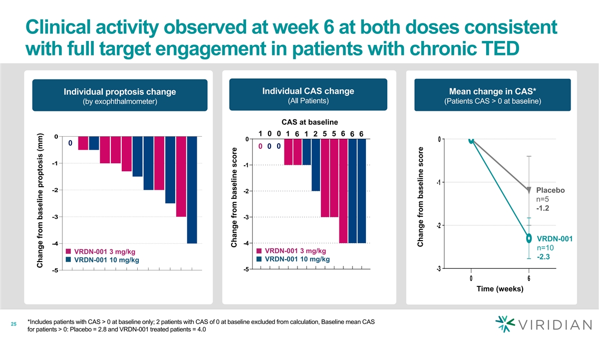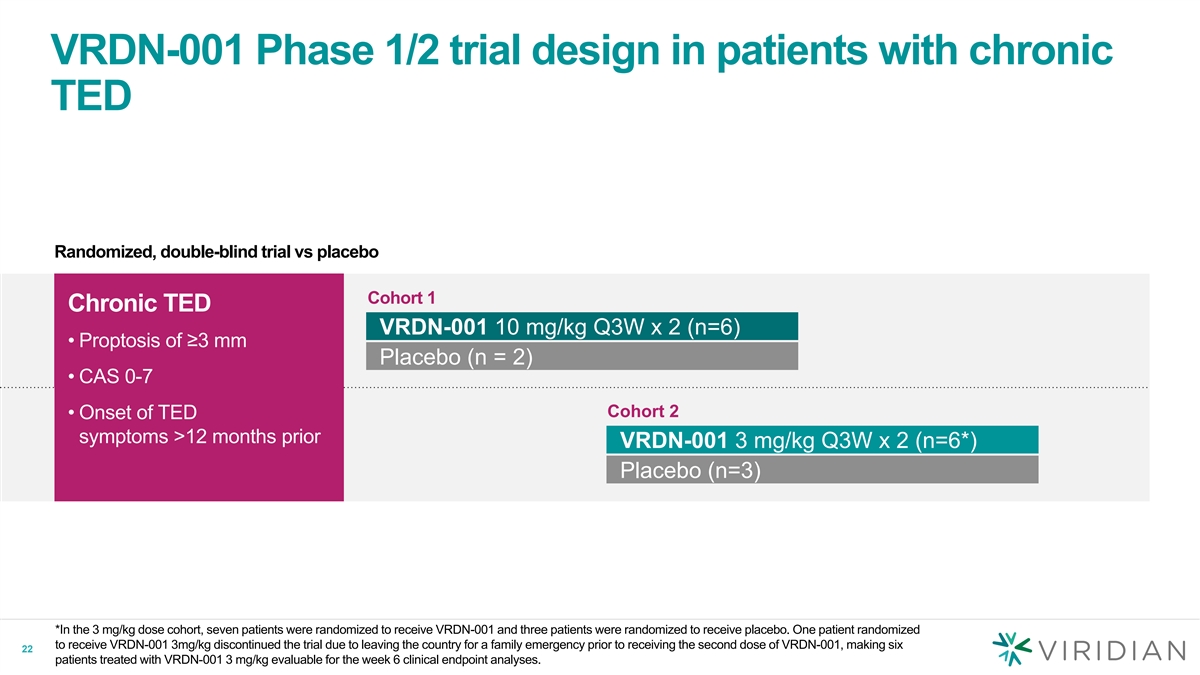 VRDN-001 Phase 1/2 trial design in patients with chronic TED Randomized, double-blind trial vs placebo Cohort 1 Chronic TED VRDN-001 10 mg/kg Q3W x 2 (n=6) • Proptosis of ≥3 mm Placebo (n = 2) • CAS 0-7 Cohort 2 • Onset of TED symptoms >12 months prior VRDN-001 3 mg/kg Q3W x 2 (n=6*) Placebo (n=3) *In the 3 mg/kg dose cohort, seven patients were randomized to receive VRDN-001 and three patients were randomized to receive placebo. One patient randomized to receive VRDN-001 3mg/kg discontinued the trial due to leaving the country for a family emergency prior to receiving the second dose of VRDN-001, making six 22 patients treated with VRDN-001 3 mg/kg evaluable for the week 6 clinical endpoint analyses.