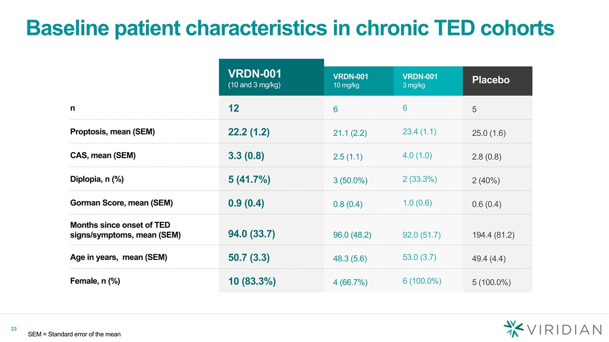Baseline patient characteristics in chronic TED cohorts VRDN-001 VRDN-001 VRDN-001 Placebo (10 and 3 mg/kg) 10 mg/kg 3 mg/kg n 6 12 6 5 Proptosis, mean (SEM) 23.4 (1.1) 22.2 (1.2) 21.1 (2.2) 25.0 (1.6) CAS, mean (SEM) 4.0 (1.0) 3.3 (0.8) 2.5 (1.1) 2.8 (0.8) Diplopia, n (%) 2 (33.3%) 5 (41.7%) 3 (50.0%) 2 (40%) Gorman Score, mean (SEM) 1.0 (0.6) 0.9 (0.4) 0.8 (0.4) 0.6 (0.4) Months since onset of TED signs/symptoms, mean (SEM) 94.0 (33.7) 96.0 (48.2) 92.0 (51.7) 194.4 (81.2) Age in years, mean (SEM) 53.0 (3.7) 50.7 (3.3) 48.3 (5.6) 49.4 (4.4) Female, n (%) 6 (100.0%) 10 (83.3%) 4 (66.7%) 5 (100.0%) 23 SEM = Standard error of the mean