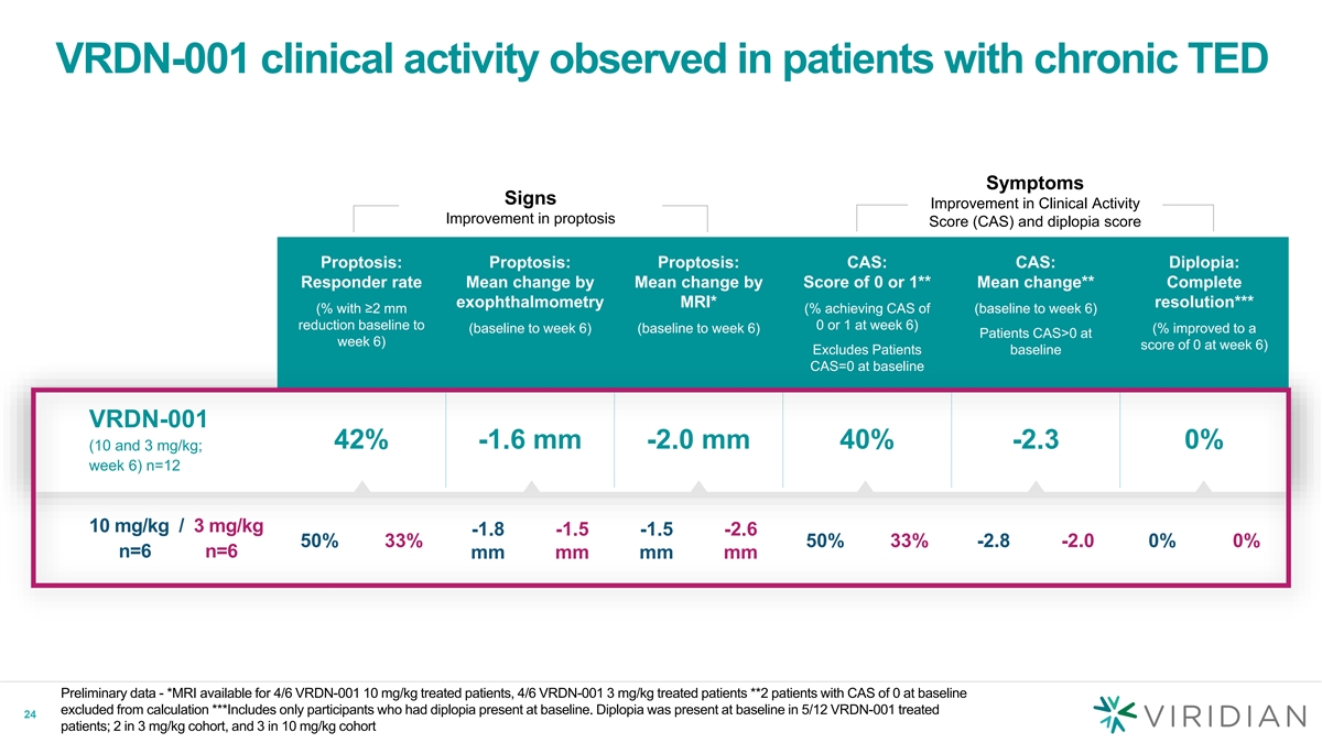 VRDN-001 clinical activity observed in patients with chronic TED Symptoms Signs Improvement in Clinical Activity Improvement in proptosis Score (CAS) and diplopia score Proptosis: Proptosis: Proptosis: CAS: CAS: Diplopia: Responder rate Mean change by Mean change by Score of 0 or 1** Mean change** Complete exophthalmometry MRI* resolution*** (% with ≥2 mm (% achieving CAS of (baseline to week 6) reduction baseline to 0 or 1 at week 6) (baseline to week 6) (baseline to week 6) (% improved to a Patients CAS>0 at week 6) score of 0 at week 6) Excludes Patients baseline CAS=0 at baseline VRDN-001 42% -1.6 mm -2.0 mm 40% -2.3 0% (10 and 3 mg/kg; week 6) n=12 10 mg/kg / 3 mg/kg -1.8 -1.5 -1.5 -2.6 50% 33% 50% 33% -2.8 -2.0 0% 0% n=6 n=6 mm mm mm mm Preliminary data - *MRI available for 4/6 VRDN-001 10 mg/kg treated patients, 4/6 VRDN-001 3 mg/kg treated patients **2 patients with CAS of 0 at baseline excluded from calculation ***Includes only participants who had diplopia present at baseline. Diplopia was present at baseline in 5/12 VRDN-001 treated 24 patients; 2 in 3 mg/kg cohort, and 3 in 10 mg/kg cohort