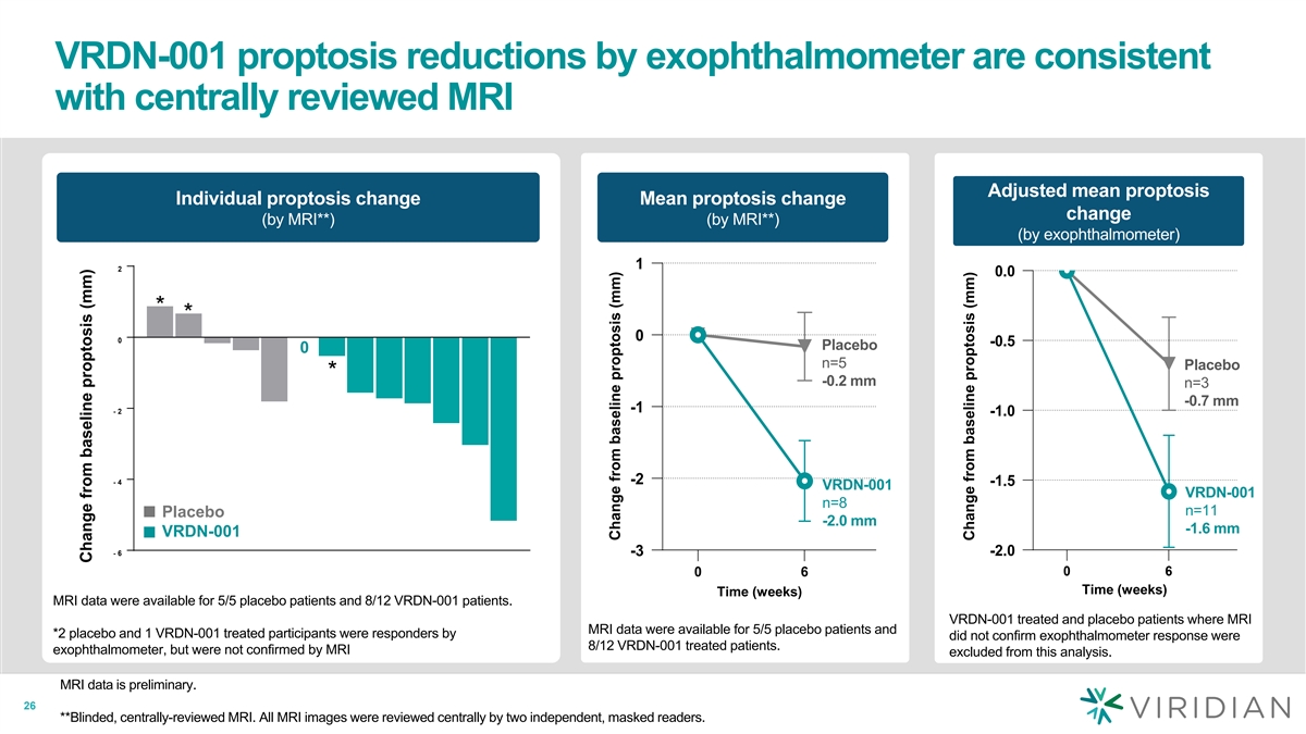 Clinical activity observed at week 6 at both doses consistent with full target engagement in patients with chronic TED Individual CAS change Mean change in CAS* Individual proptosis change (All Patients) (Patients CAS > 0 at baseline) (by exophthalmometer) CAS at baseline 1 0 0 5 6 1 6 1 2 5 6 6 0 0 0 0 0 0 0 -1 -1 -1 -2 Placebo -2 n=5 -1.2 -3 -3 -2 VRDN-001 -4 -4 n=10 VRDN-001 3 mg/kg VRDN-001 3 mg/kg -2.3 VRDN-001 10 mg/kg VRDN-001 10 mg/kg -5 -3 -5 0 6 Time (weeks) *Includes patients with CAS > 0 at baseline only; 2 patients with CAS of 0 at baseline excluded from calculation, Baseline mean CAS 25 for patients > 0: Placebo = 2.8 and VRDN-001 treated patients = 4.0 Change from baseline proptosis (mm) Change from baseline score Change from baseline score
