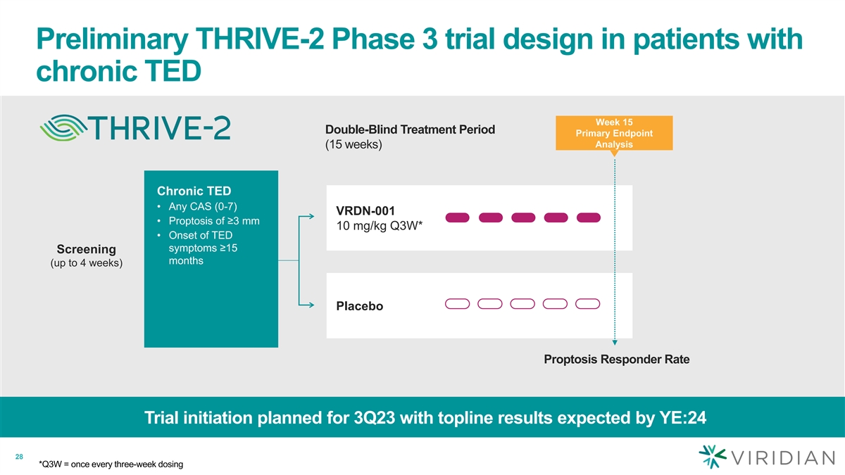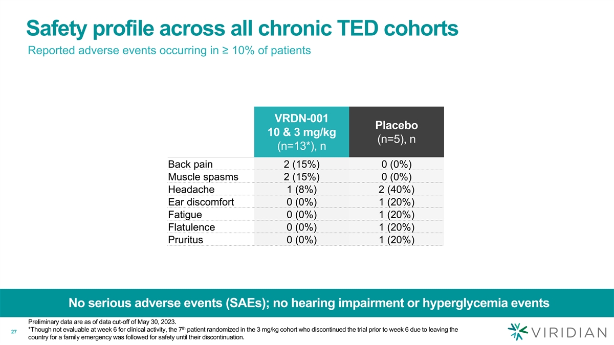 Safety profile across all chronic TED cohorts Reported adverse events occurring in ≥ 10% of patients VRDN-001 Placebo 10 & 3 mg/kg (n=5), n (n=13*), n Back pain 2 (15%) 0 (0%) Muscle spasms 2 (15%) 0 (0%) Headache 1 (8%) 2 (40%) Ear discomfort 0 (0%) 1 (20%) Fatigue 0 (0%) 1 (20%) Flatulence 0 (0%) 1 (20%) Pruritus 0 (0%) 1 (20%) No serious adverse events (SAEs); no hearing impairment or hyperglycemia events Preliminary data are as of data cut-off of May 30, 2023. th *Though not evaluable at week 6 for clinical activity, the 7 patient randomized in the 3 mg/kg cohort who discontinued the trial prior to week 6 due to leaving the 27 country for a family emergency was followed for safety until their discontinuation.