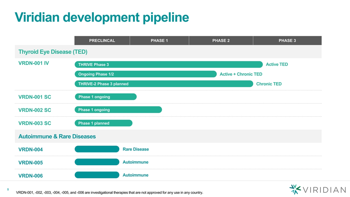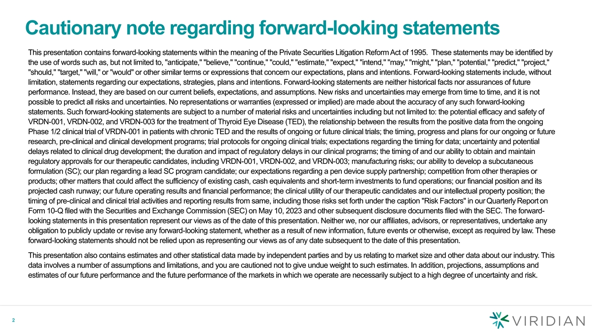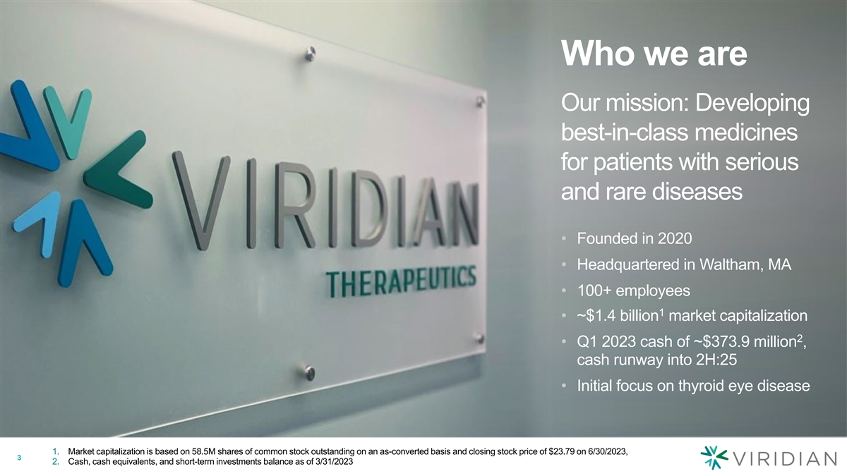Cautionary note regarding forward-looking statements This presentation contains forward-looking statements within the meaning of the Private Securities Litigation Reform Act of 1995. These statements may be identified by the use of words such as, but not limited to, anticipate, believe, continue, could, estimate, expect, intend, may, might, plan, potential, predict, project, should, target, will, or would or other similar terms or expressions that concern our expectations, plans and intentions. Forward-looking statements include, without limitation, statements regarding our expectations, strategies, plans and intentions. Forward-looking statements are neither historical facts nor assurances of future performance. Instead, they are based on our current beliefs, expectations, and assumptions. New risks and uncertainties may emerge from time to time, and it is not possible to predict all risks and uncertainties. No representations or warranties (expressed or implied) are made about the accuracy of any such forward-looking statements. Such forward-looking statements are subject to a number of material risks and uncertainties including but not limited to: the potential efficacy and safety of VRDN-001, VRDN-002, and VRDN-003 for the treatment of Thyroid Eye Disease (TED), the relationship between the results from the positive data from the ongoing Phase 1/2 clinical trial of VRDN-001 in patients with chronic TED and the results of ongoing or future clinical trials; the timing, progress and plans for our ongoing or future research, pre-clinical and clinical development programs; trial protocols for ongoing clinical trials; expectations regarding the timing for data; uncertainty and potential delays related to clinical drug development; the duration and impact of regulatory delays in our clinical programs; the timing of and our ability to obtain and maintain regulatory approvals for our therapeutic candidates, including VRDN-001, VRDN-002, and VRDN-003; manufacturing risks; our ability to develop a subcutaneous formulation (SC); our plan regarding a lead SC program candidate; our expectations regarding a pen device supply partnership; competition from other therapies or products; other matters that could affect the sufficiency of existing cash, cash equivalents and short-term investments to fund operations; our financial position and its projected cash runway; our future operating results and financial performance; the clinical utility of our therapeutic candidates and our intellectual property position; the timing of pre-clinical and clinical trial activities and reporting results from same, including those risks set forth under the caption Risk Factors in our Quarterly Report on Form 10-Q filed with the Securities and Exchange Commission (SEC) on May 10, 2023 and other subsequent disclosure documents filed with the SEC. The forward- looking statements in this presentation represent our views as of the date of this presentation. Neither we, nor our affiliates, advisors, or representatives, undertake any obligation to publicly update or revise any forward-looking statement, whether as a result of new information, future events or otherwise, except as required by law. These forward-looking statements should not be relied upon as representing our views as of any date subsequent to the date of this presentation. This presentation also contains estimates and other statistical data made by independent parties and by us relating to market size and other data about our industry. This data involves a number of assumptions and limitations, and you are cautioned not to give undue weight to such estimates. In addition, projections, assumptions and estimates of our future performance and the future performance of the markets in which we operate are necessarily subject to a high degree of uncertainty and risk. 2