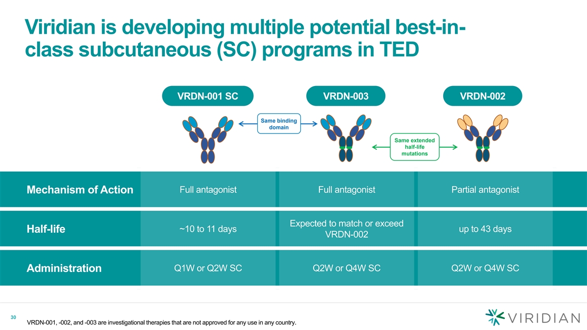 Viridian is developing multiple potential best-in- class subcutaneous (SC) programs in TED VRDN-001 SC VRDN-003 VRDN-002 Same binding domain Same extended half-life mutations Full antagonist Full antagonist Partial antagonist Mechanism of Action Expected to match or exceed ~10 to 11 days up to 43 days Half-life VRDN-002 Q1W or Q2W SC Q2W or Q4W SC Q2W or Q4W SC Administration 30 VRDN-001, -002, and -003 are investigational therapies that are not approved for any use in any country.