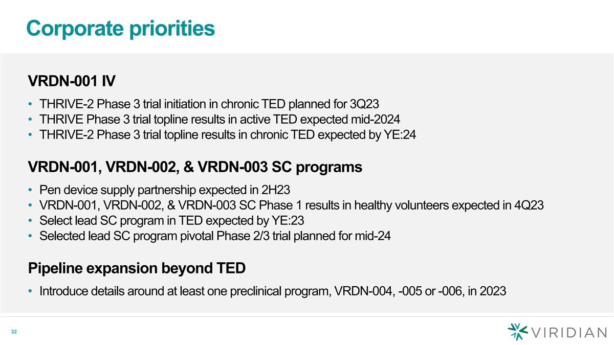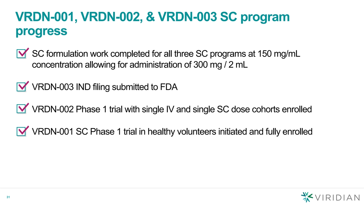 VRDN-001, VRDN-002, & VRDN-003 SC program progress • SC formulation work completed for all three SC programs at 150 mg/mL concentration allowing for administration of 300 mg / 2 mL • VRDN-003 IND filing submitted to FDA • VRDN-002 Phase 1 trial with single IV and single SC dose cohorts enrolled • VRDN-001 SC Phase 1 trial in healthy volunteers initiated and fully enrolled 31