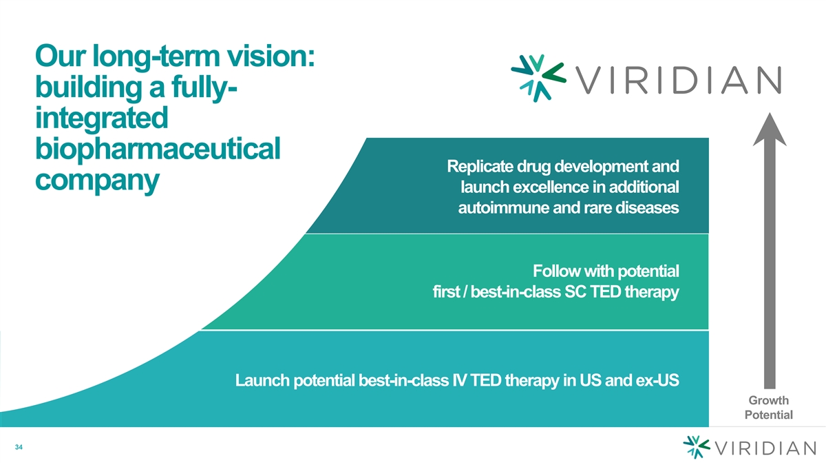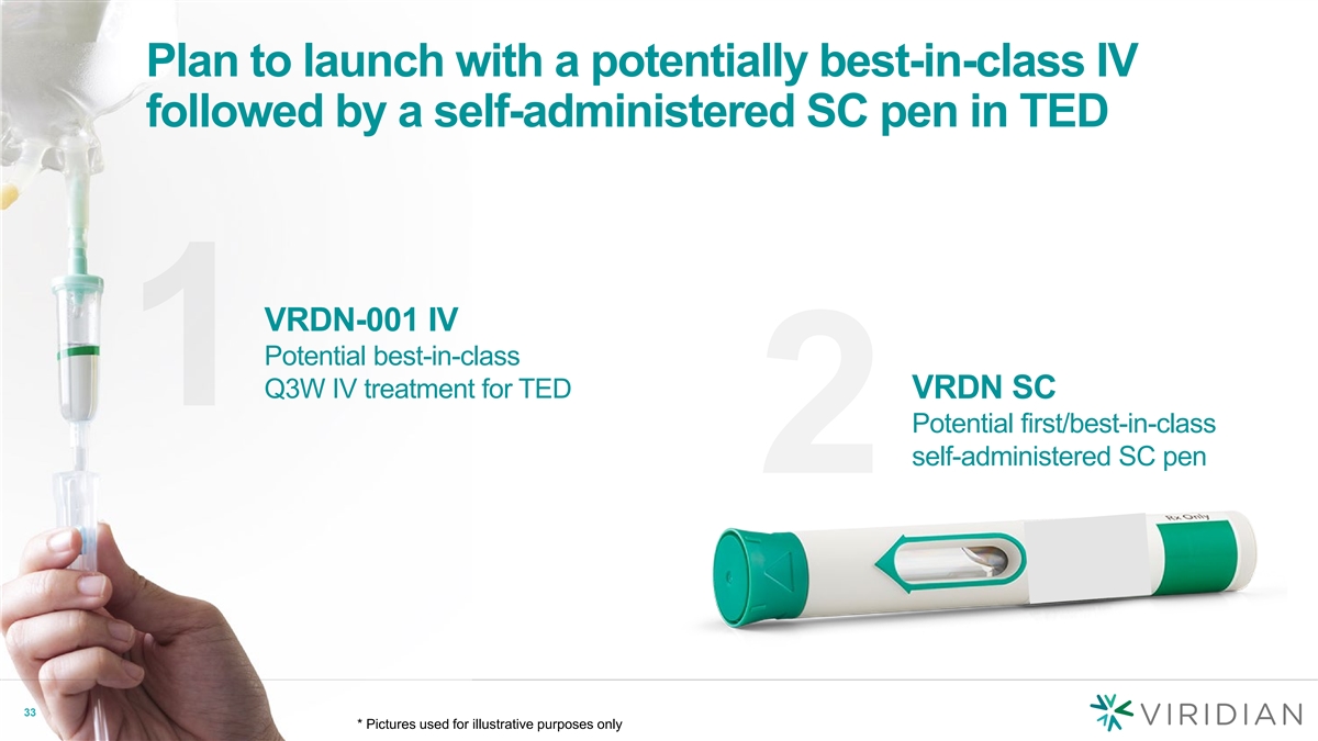 Plan to launch with a potentially best-in-class IV followed by a self-administered SC pen in TED VRDN-001 IV Potential best-in-class Q3W IV treatment for TED VRDN SC Potential first/best-in-class self-administered SC pen 2 33 33 * Pictures used for illustrative purposes only