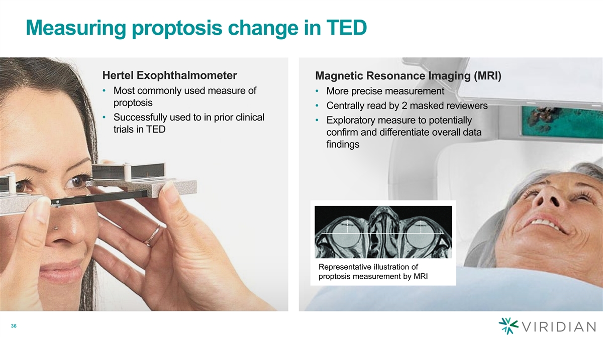 Measuring proptosis change in TED Hertel Exophthalmometer Magnetic Resonance Imaging (MRI) • Most commonly used measure of • More precise measurement proptosis • Centrally read by 2 masked reviewers • Successfully used to in prior clinical • Exploratory measure to potentially trials in TED confirm and differentiate overall data findings Representative illustration of proptosis measurement by MRI 36