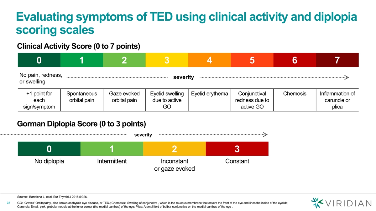Evaluating symptoms of TED using clinical activity and diplopia scoring scales Clinical Activity Score (0 to 7 points) 0 1 2 3 4 5 6 7 No pain, redness, severity or swelling +1 point for Spontaneous Gaze evoked Eyelid swelling Eyelid erythema Conjunctival Chemosis Inflammation of each orbital pain orbital pain due to active redness due to caruncle or sign/symptom GO active GO plica Gorman Diplopia Score (0 to 3 points) severity 0 1 2 3 No diplopia Intermittent Inconstant Constant or gaze evoked Source: Bartalena L, et al. Eur Thyroid J 2016;5:926. 37 GO: Graves’ Orbitopathy, also known as thyroid eye disease, or TED.; Chemosis: Swelling of conjunctiva , which is the mucous membrane that covers the front of the eye and lines the inside of the eyelids; Caruncle: Small, pink, globular nodule at the inner corner (the medial canthus) of the eye; Plica: A small fold of bulbar conjunctiva on the medial canthus of the eye .
