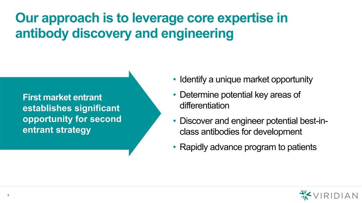 Who we are Our mission: Developing best-in-class medicines for patients with serious and rare diseases • Founded in 2020 • Headquartered in Waltham, MA • 100+ employees 1 • ~$1.4 billion market capitalization 2 • Q1 2023 cash of ~$373.9 million , cash runway into 2H:25 • Initial focus on thyroid eye disease 1. Market capitalization is based on 58.5M shares of common stock outstanding on an as-converted basis and closing stock price of $23.79 on 6/30/2023, 3 3 2. Cash, cash equivalents, and short-term investments balance as of 3/31/2023