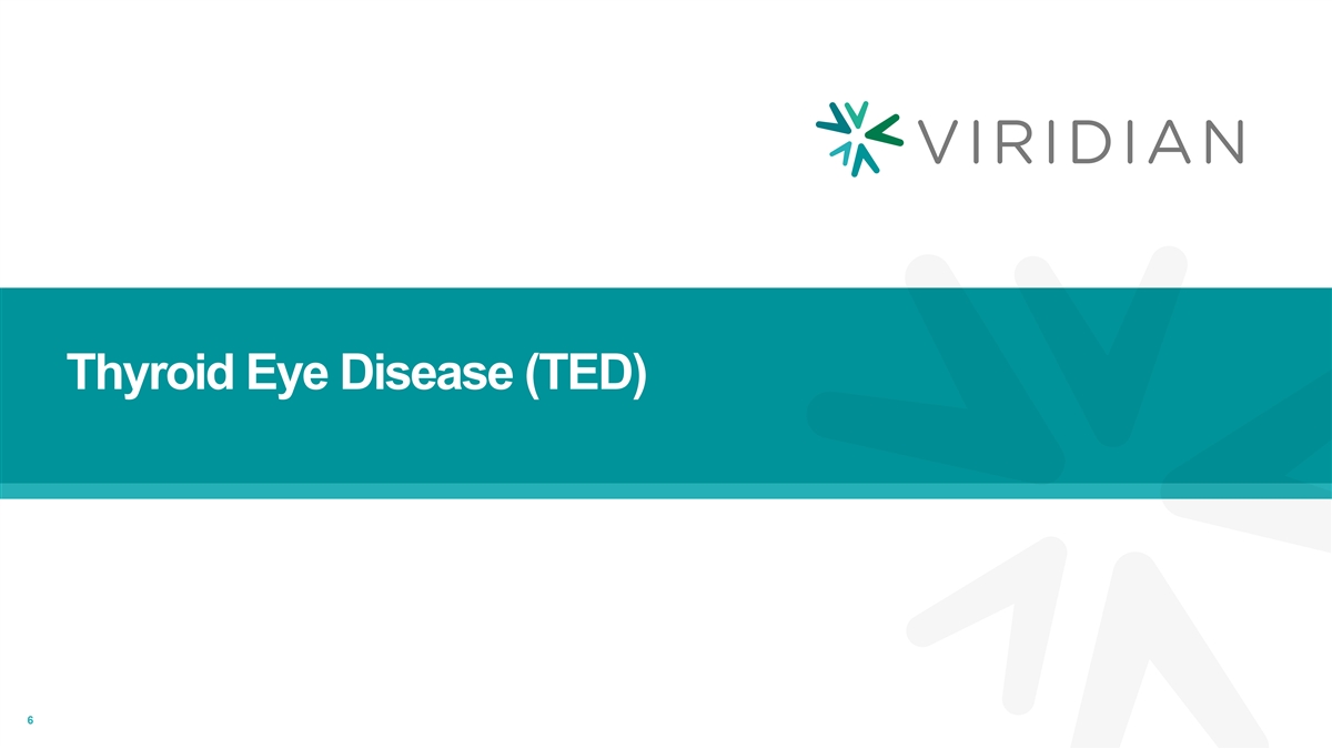 Viridian development pipeline PRECLINCAL PHASE 1 PHASE 2 PHASE 3 Thyroid Eye Disease (TED) VRDN-001 IV THRIVE Phase 3 Active TED Ongoing Phase 1/2 Active + Chronic TED THRIVE-2 Phase 3 planned Chronic TED Phase 1 ongoing VRDN-001 SC Phase 1 ongoing VRDN-002 SC Phase 1 planned VRDN-003 SC Autoimmune & Rare Diseases Rare Disease VRDN-004 Autoimmune VRDN-005 Autoimmune VRDN-006 5 VRDN-001, -002, -003, -004, -005, and -006 are investigational therapies that are not approved for any use in any country.