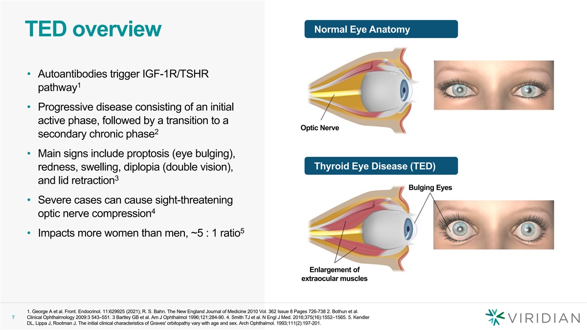Normal Eye Anatomy TED overview • Autoantibodies trigger IGF-1R/TSHR 1 pathway • Progressive disease consisting of an initial active phase, followed by a transition to a Optic Nerve 2 secondary chronic phase • Main signs include proptosis (eye bulging), Thyroid Eye Disease (TED) redness, swelling, diplopia (double vision), 3 and lid retraction Bulging Eyes • Severe cases can cause sight-threatening 4 optic nerve compression 5 • Impacts more women than men, ~5 : 1 ratio Enlargement of extraocular muscles 1. George A et al. Front. Endocrinol. 11:629925 (2021); R. S. Bahn. The New England Journal of Medicine 2010 Vol. 362 Issue 8 Pages 726-738 2. Bothun et al. 7 Clinical Ophthalmology 2009:3 543–551. 3 Bartley GB et al. Am J Ophthalmol 1996;121:284-90. 4. Smith TJ et al. N Engl J Med. 2016;375(16):1552–1565. 5. Kendler DL, Lippa J, Rootman J. The initial clinical characteristics of Graves' orbitopathy vary with age and sex. Arch Ophthalmol. 1993;111(2):197-201.