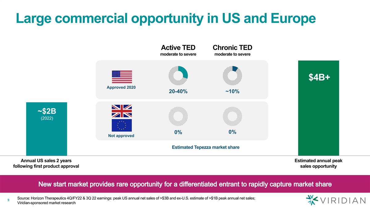TED Epidemiology in US and Europe Active TED moderate to severe 20K+ 35K+ Chronic TED moderate to severe 75K+ 150K+ More than 95K patients in US and 185K patients in Europe with moderate to severe TED = 1,000 estimated patients 8 Source: Viridian-sponsored market research