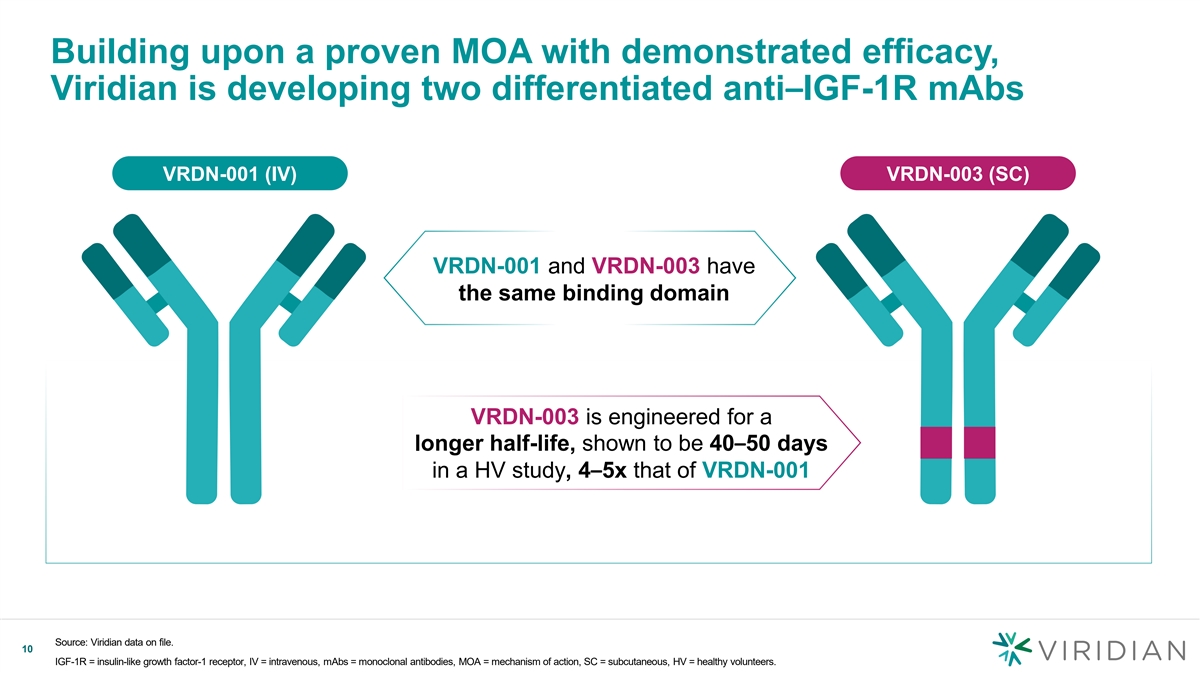Building upon a proven MOA with demonstrated efficacy, Viridian is developing two differentiated anti–IGF-1R mAbs VRDN-001 (IV) VRDN-003 (SC) VRDN-001 and VRDN-003 have the same binding domain VRDN-003 is engineered for a longer half-life, shown to be 40–50 days in a HV study, 4–5x that of VRDN-001 Source: Viridian data on file. 10 IGF-1R = insulin-like growth factor-1 receptor, IV = intravenous, mAbs = monoclonal antibodies, MOA = mechanism of action, SC = subcutaneous, HV = healthy volunteers.