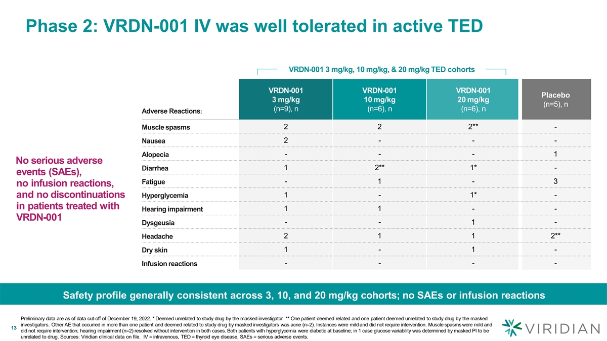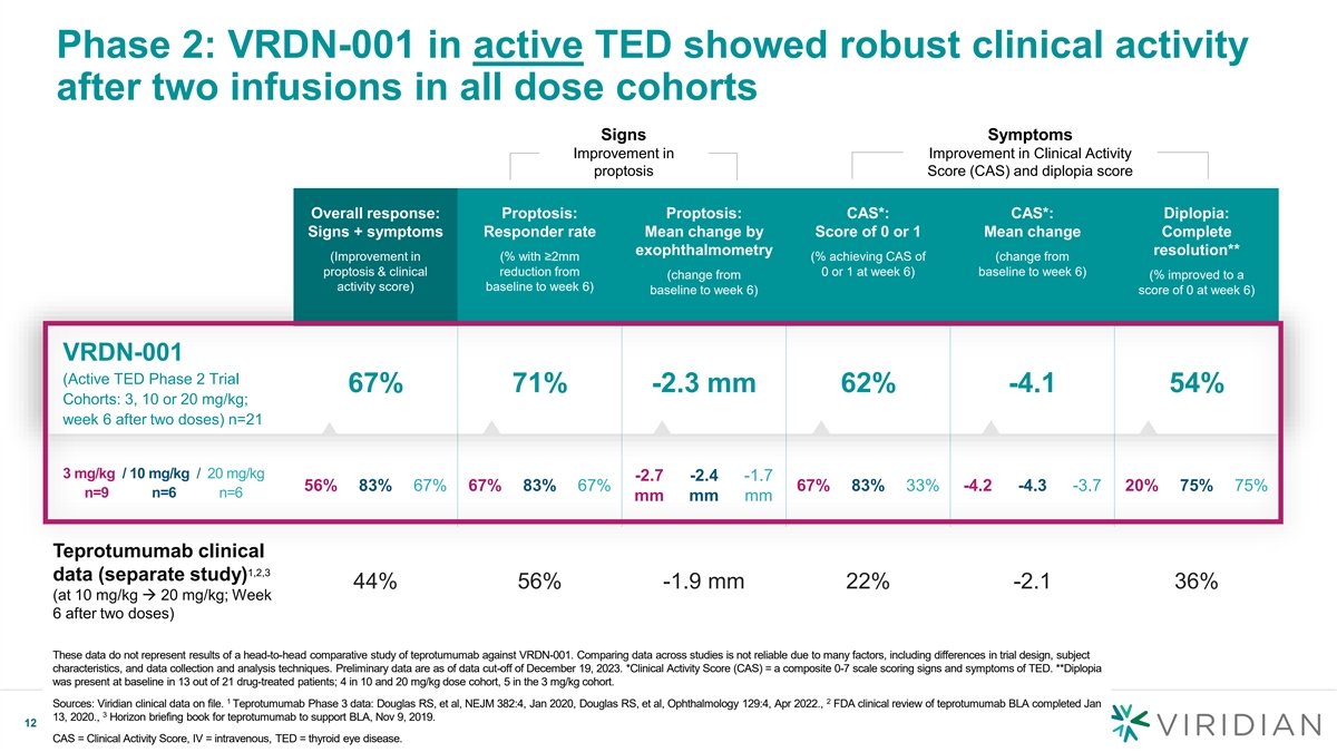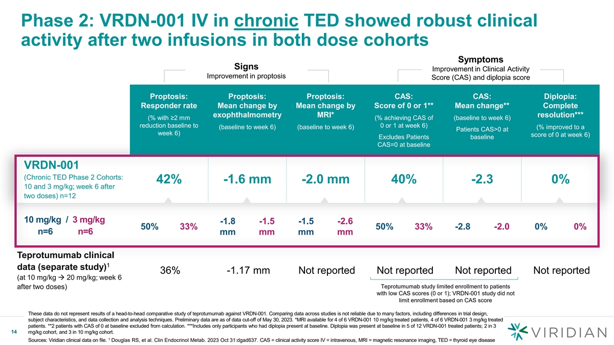 Phase 2: VRDN-001 in active TED showed robust clinical activity after two infusions in all dose cohorts Signs Symptoms Improvement in Improvement in Clinical Activity proptosis Score (CAS) and diplopia score Overall response: Proptosis: Proptosis: CAS*: CAS*: Diplopia: Signs + symptoms Responder rate Mean change by Score of 0 or 1 Mean change Complete exophthalmometry resolution** (Improvement in (% with ≥2mm (% achieving CAS of (change from proptosis & clinical reduction from 0 or 1 at week 6) baseline to week 6) (change from (% improved to a activity score) baseline to week 6) baseline to week 6) score of 0 at week 6) VRDN-001 (Active TED Phase 2 Trial 67% 71% -2.3 mm 62% -4.1 54% Cohorts: 3, 10 or 20 mg/kg; week 6 after two doses) n=21 3 mg/kg / 10 mg/kg / 20 mg/kg -2.7 -2.4 -1.7 56% 83% 67% 67% 83% 67% 67% 83% 33% -4.2 -4.3 -3.7 20% 75% 75% n=9 n=6 n=6 mm mm mm Teprotumumab clinical 1,2,3 data (separate study) 44% 56% -1.9 mm 22% -2.1 36% (at 10 mg/kg → 20 mg/kg; Week 6 after two doses) These data do not represent results of a head-to-head comparative study of teprotumumab against VRDN-001. Comparing data across studies is not reliable due to many factors, including differences in trial design, subject characteristics, and data collection and analysis techniques. Preliminary data are as of data cut-off of December 19, 2023. *Clinical Activity Score (CAS) = a composite 0-7 scale scoring signs and symptoms of TED. **Diplopia was present at baseline in 13 out of 21 drug-treated patients; 4 in 10 and 20 mg/kg dose cohort, 5 in the 3 mg/kg cohort. 1 2 Sources: Viridian clinical data on file. Teprotumumab Phase 3 data: Douglas RS, et al, NEJM 382:4, Jan 2020, Douglas RS, et al, Ophthalmology 129:4, Apr 2022., FDA clinical review of teprotumumab BLA completed Jan 3 13, 2020., Horizon briefing book for teprotumumab to support BLA, Nov 9, 2019. 12 CAS = Clinical Activity Score, IV = intravenous, TED = thyroid eye disease.