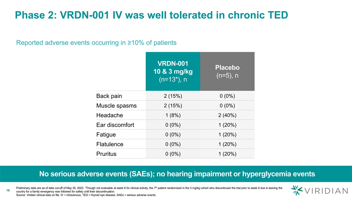 Phase 2: VRDN-001 IV was well tolerated in chronic TED Reported adverse events occurring in ≥10% of patients VRDN-001 Placebo 10 & 3 mg/kg (n=5), n (n=13*), n Back pain 2 (15%) 0 (0%) 2 (15%) 0 (0%) Muscle spasms 1 (8%) 2 (40%) Headache Ear discomfort 0 (0%) 1 (20%) 0 (0%) 1 (20%) Fatigue 0 (0%) 1 (20%) Flatulence Pruritus 0 (0%) 1 (20%) No serious adverse events (SAEs); no hearing impairment or hyperglycemia events th Preliminary data are as of data cut-off of May 30, 2023. *Though not evaluable at week 6 for clinical activity, the 7 patient randomized in the 3 mg/kg cohort who discontinued the trial prior to week 6 due to leaving the 15 country for a family emergency was followed for safety until their discontinuation. Source: Viridian clinical data on file. IV = intravenous, TED = thyroid eye disease, SAEs = serious adverse events.