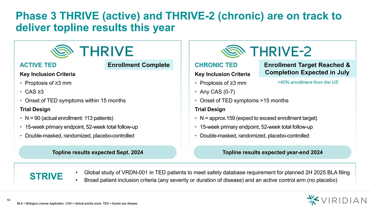 Phase 2: VRDN-001 IV in chronic TED showed robust clinical activity after two infusions in both dose cohorts Symptoms Signs Improvement in Clinical Activity Improvement in proptosis Score (CAS) and diplopia score Proptosis: Proptosis: Proptosis: CAS: CAS: Diplopia: Responder rate Mean change by Mean change by Score of 0 or 1** Mean change** Complete exophthalmometry MRI* resolution*** (% with ≥2 mm (% achieving CAS of (baseline to week 6) reduction baseline to 0 or 1 at week 6) (baseline to week 6) (baseline to week 6) (% improved to a Patients CAS>0 at week 6) score of 0 at week 6) Excludes Patients baseline CAS=0 at baseline VRDN-001 (Chronic TED Phase 2 Cohorts: 42% -1.6 mm -2.0 mm 40% -2.3 0% 10 and 3 mg/kg; week 6 after two doses) n=12 10 mg/kg / 3 mg/kg -1.8 -1.5 -1.5 -2.6 50% 33% 50% 33% -2.8 -2.0 0% 0% n=6 n=6 mm mm mm mm Teprotumumab clinical 1 data (separate study) 36% -1.17 mm Not reported Not reported Not reported Not reported (at 10 mg/kg → 20 mg/kg; week 6 Teprotumumab study limited enrollment to patients after two doses) with low CAS scores (0 or 1); VRDN-001 study did not limit enrollment based on CAS score These data do not represent results of a head-to-head comparative study of teprotumumab against VRDN-001. Comparing data across studies is not reliable due to many factors, including differences in trial design, subject characteristics, and data collection and analysis techniques. Preliminary data are as of data cut-off of May 30, 2023. *MRI available for 4 of 6 VRDN-001 10 mg/kg treated patients, 4 of 6 VRDN-001 3 mg/kg treated patients. **2 patients with CAS of 0 at baseline excluded from calculation. ***Includes only participants who had diplopia present at baseline. Diplopia was present at baseline in 5 of 12 VRDN-001 treated patients; 2 in 3 14 mg/kg cohort, and 3 in 10 mg/kg cohort. 1 Sources: Viridian clinical data on file. Douglas RS, et al. Clin Endocrinol Metab. 2023 Oct 31:dgad637. CAS = clinical activity score IV = intravenous, MRI = magnetic resonance imaging, TED = thyroid eye disease