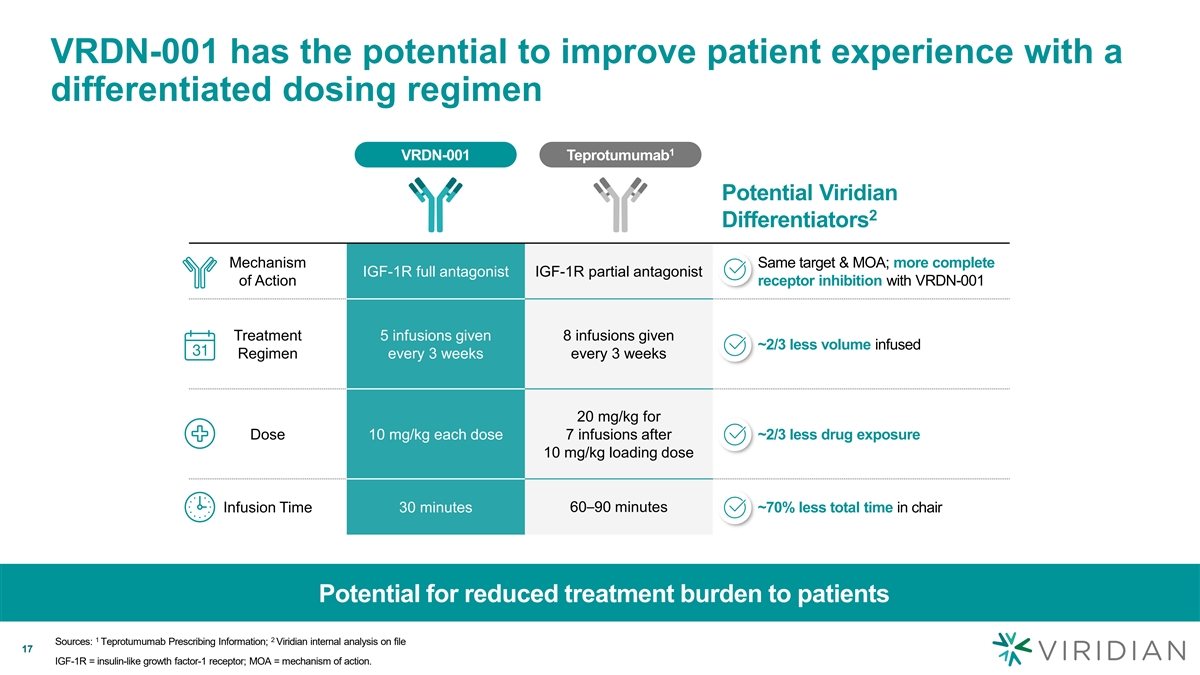 Phase 3 THRIVE (active) and THRIVE-2 (chronic) are on track to deliver topline results this year ACTIVE TED Enrollment Complete CHRONIC TED Enrollment Target Reached & Completion Expected in July Key Inclusion Criteria Key Inclusion Criteria >40% enrollment from the US • Proptosis of ≥3 mm • Proptosis of ≥3 mm • CAS ≥3 • Any CAS (0-7) • Onset of TED symptoms within 15 months • Onset of TED symptoms >15 months Trial Design Trial Design • N = 90 (actual enrollment: 113 patients) • N = approx.159 (expect to exceed enrollment target) • 15-week primary endpoint, 52-week total follow-up • 15-week primary endpoint, 52-week total follow-up • Double-masked, randomized, placebo-controlled • Double-masked, randomized, placebo-controlled Topline results expected Sept. 2024 Topline results expected year-end 2024 • Global study of VRDN-001 in TED patients to meet safety database requirement for planned 2H 2025 BLA filing STRIVE • Broad patient inclusion criteria (any severity or duration of disease) and an active control arm (no placebo) 16 BLA = Biologics License Application, CAS = clinical activity score, TED = thyroid eye disease.