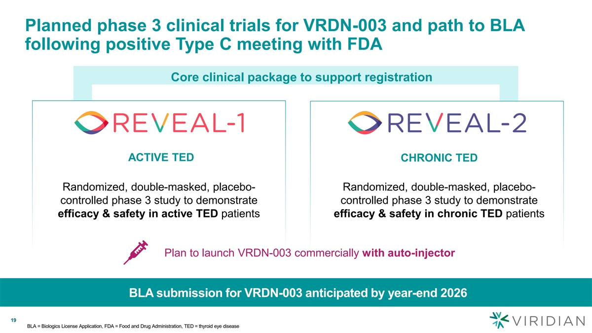 Planned phase 3 clinical trials for VRDN-003 and path to BLA following positive Type C meeting with FDA Core clinical package to support registration ACTIVE TED CHRONIC TED Randomized, double-masked, placebo- Randomized, double-masked, placebo- controlled phase 3 study to demonstrate controlled phase 3 study to demonstrate efficacy & safety in active TED patients efficacy & safety in chronic TED patients Plan to launch VRDN-003 commercially with auto-injector BLA submission for VRDN-003 anticipated by year-end 2026 19 BLA = Biologics License Application, FDA = Food and Drug Administration, TED = thyroid eye disease