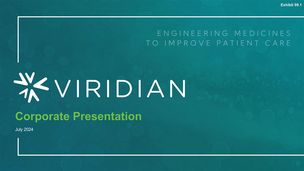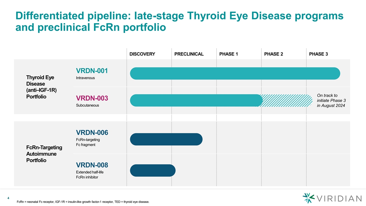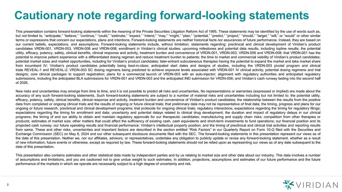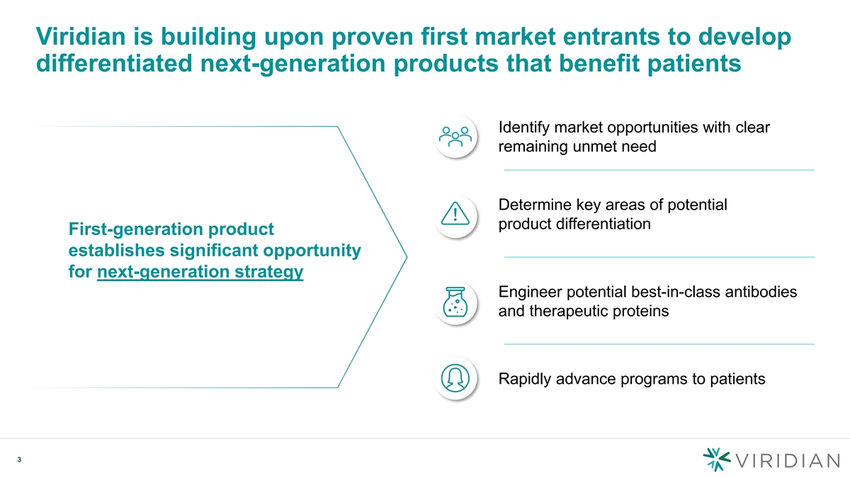 Cautionary note regarding forward-looking statements This presentation contains forward-looking statements within the meaning of the Private Securities Litigation Reform Act of 1995. These statements may be identified by the use of words such as, but not limited to, “anticipate,” “believe,” “continue,” “could,” “estimate,” “expect,” “intend,” “may,” “might,” “plan,” “potential,” “predict,” “project,” “should,” “target,” “will,” or “would” or other similar terms or expressions that concern our expectations, plans and intentions. Forward-looking statements are neither historical facts nor assurances of future performance. Instead, they are based on our current beliefs, expectations, and assumptions. Forward-looking statements include, without limitation, statements regarding: preclinical and clinical development of Viridian’s product candidates VRDN-001, VRDN-003, VRDN-006 and VRDN-008; enrollment in Viridian’s clinical studies; upcoming milestones and potential data results, including topline results; the potential utility, efficacy, potency, safety, clinical benefits, clinical response and activity, treatment burden and convenience of VRDN-001, VRDN-003, VRDN-006 and VRDN-008; that VRDN-001 has the potential to improve patient experience with a differentiated dosing regimen and reduce treatment burden to patients; the time to market and commercial viability of Viridian’s product candidates; potential market sizes and market opportunities, including for Viridian’s product candidates; later-entrant subcutaneous therapies having the potential to expand the market and take market share from incumbent IV; Viridian’s product candidates potentially being best-in-class; anticipated start dates and designs of studies, including the VRDN-003 pivotal program and clinical trials REVEAL-1 and REVEAL-2; VRDN-003 SC dosing regimens being predicted to achieve exposure levels associated with VRDN-001 IV clinical activity; potential dosing regimens and trial designs; core clinical packages to support registration; plans for a commercial launch of VRDN-003 with an auto-injector; alignment with regulatory authorities and anticipated regulatory submissions, including the anticipated BLA submissions for VRDN-001 and VRDN-003 and the anticipated IND submission for VRDN-006; and Viridian’s cash runway lasting into the second half of 2026. New risks and uncertainties may emerge from time to time, and it is not possible to predict all risks and uncertainties. No representations or warranties (expressed or implied) are made about the accuracy of any such forward-looking statements. Such forward-looking statements are subject to a number of material risks and uncertainties including but not limited to: the potential utility, efficacy, potency, safety, clinical benefits, clinical response and activity, treatment burden and convenience of Viridian’s product candidates; the relationship between the results from the positive data from completed or ongoing clinical trials and the results of ongoing or future clinical trials; that preliminary data may not be representative of final data; the timing, progress and plans for our ongoing or future research, preclinical and clinical development programs; trial protocols for ongoing clinical trials; regulatory interactions; expectations regarding the timing for regulatory filings; expectations regarding the timing for enrollment and data; uncertainty and potential delays related to clinical drug development; the duration and impact of regulatory delays in our clinical programs; the timing of and our ability to obtain and maintain regulatory approvals for our therapeutic candidates; manufacturing and supply chain risks; competition from other therapies or products; estimates of market size; other matters that could affect the sufficiency of existing cash, cash equivalents and short-term investments to fund operations; our financial position and its projected cash runway; our future operating results and financial performance; Viridian’s intellectual property position; and the timing of preclinical and clinical trial activities and reporting results from same. These and other risks, uncertainties and important factors are described in the section entitled “Risk Factors” in our Quarterly Report on Form 10-Q filed with the Securities and Exchange Commission (SEC) on May 8, 2024 and our other subsequent disclosure documents filed with the SEC. The forward-looking statements in this presentation represent our views as of the date of this presentation. Neither we, nor our affiliates, advisors, or representatives, undertake any obligation to publicly update or revise any forward-looking statement, whether as a result of new information, future events or otherwise, except as required by law. These forward-looking statements should not be relied upon as representing our views as of any date subsequent to the date of this presentation. This presentation also contains estimates and other statistical data made by independent parties and by us relating to market size and other data about our industry. This data involves a number of assumptions and limitations, and you are cautioned not to give undue weight to such estimates. In addition, projections, assumptions and estimates of our future performance and the future performance of the markets in which we operate are necessarily subject to a high degree of uncertainty and risk. 2