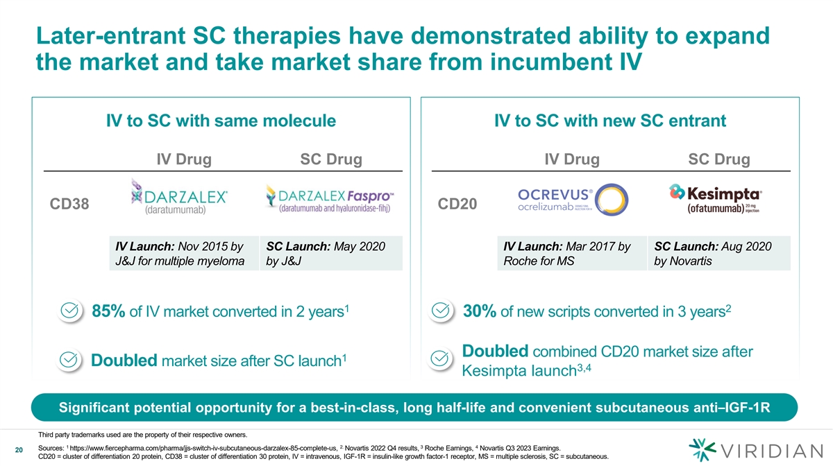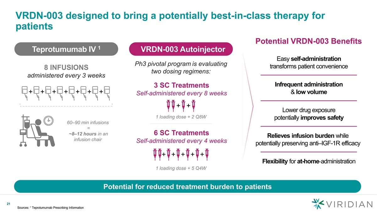 Later-entrant SC therapies have demonstrated ability to expand the market and take market share from incumbent IV IV to SC with same molecule IV to SC with new SC entrant IV Drug SC Drug IV Drug SC Drug CD38 CD20 IV Launch: Nov 2015 by SC Launch: May 2020 IV Launch: Mar 2017 by SC Launch: Aug 2020 J&J for multiple myeloma by J&J Roche for MS by Novartis 1 2 • 85% of IV market converted in 2 years • 30% of new scripts converted in 3 years • Doubled combined CD20 market size after 1 • Doubled market size after SC launch 3,4 Kesimpta launch Significant potential opportunity for a best-in-class, long half-life and convenient subcutaneous anti–IGF-1R Third party trademarks used are the property of their respective owners. 1 2. 3 4 Sources: https://www.fiercepharma.com/pharma/jjs-switch-iv-subcutaneous-darzalex-85-complete-us, Novartis 2022 Q4 results, Roche Earnings, Novartis Q3 2023 Earnings. 20 CD20 = cluster of differentiation 20 protein, CD38 = cluster of differentiation 30 protein, IV = intravenous, IGF-1R = insulin-like growth factor-1 receptor, MS = multiple sclerosis, SC = subcutaneous.
