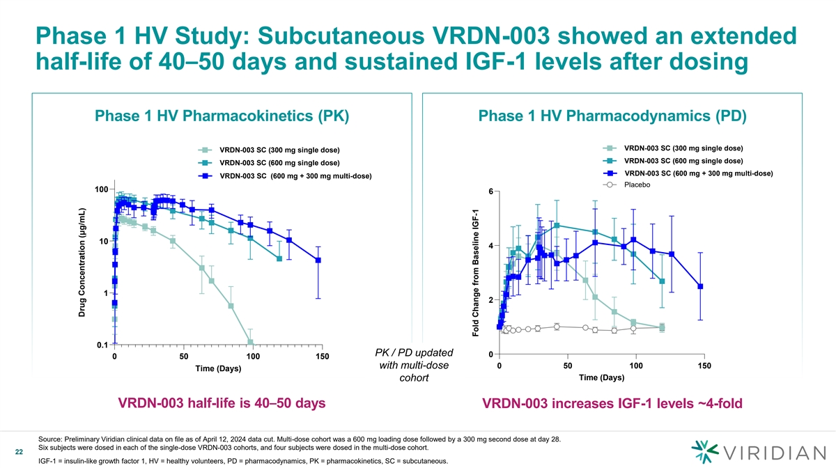 VRDN-003 designed to bring a potentially best-in-class therapy for patients Potential VRDN-003 Benefits 1 Teprotumumab IV VRDN-003 Autoinjector Easy self-administration Ph3 pivotal program is evaluating transforms patient convenience 8 INFUSIONS two dosing regimens: administered every 3 weeks Infrequent administration 3 SC Treatments + + + + + + + & low volume Self-administered every 8 weeks + + Lower drug exposure 1 loading dose + 2 Q8W potentially improves safety 60–90 min infusions = ~8–12 hours in an 6 SC Treatments Relieves infusion burden while infusion chair Self-administered every 4 weeks potentially preserving anti–IGF-1R efficacy + + + + + Flexibility for at-home administration 1 loading dose + 5 Q4W Potential for reduced treatment burden to patients 21 1 Sources: Teprotumumab Prescribing Information