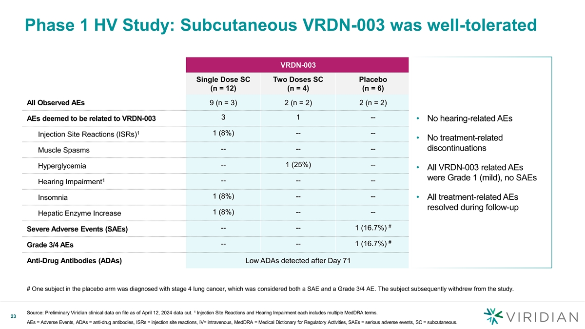 Phase 1 HV Study: Subcutaneous VRDN-003 showed an extended half-life of 40–50 days and sustained IGF-1 levels after dosing Phase 1 HV Pharmacokinetics (PK) Phase 1 HV Pharmacodynamics (PD) VRDN-003 SC (300 mg single dose) VRDN-003 SC (300 mg single dose) VRDN-003 SC (600 mg single dose) VRDN-003 SC (600 mg single dose) VRDN-003 SC (600 mg + 300 mg multi-dose) VRDN-003 SC (600 mg + 300 mg multi-dose) Placebo 100 6 10 4 1 2 0.1 PK / PD updated 0 0 50 100 150 0 50 100 150 with multi-dose Time (Days) Time (Days) cohort VRDN-003 half-life is 40–50 days VRDN-003 increases IGF-1 levels ~4-fold Source: Preliminary Viridian clinical data on file as of April 12, 2024 data cut. Multi-dose cohort was a 600 mg loading dose followed by a 300 mg second dose at day 28. Six subjects were dosed in each of the single-dose VRDN-003 cohorts, and four subjects were dosed in the multi-dose cohort. 22 IGF-1 = insulin-like growth factor 1, HV = healthy volunteers, PD = pharmacodynamics, PK = pharmacokinetics, SC = subcutaneous. Drug Concentration (μg/mL) Fold Change from Baseline IGF-1