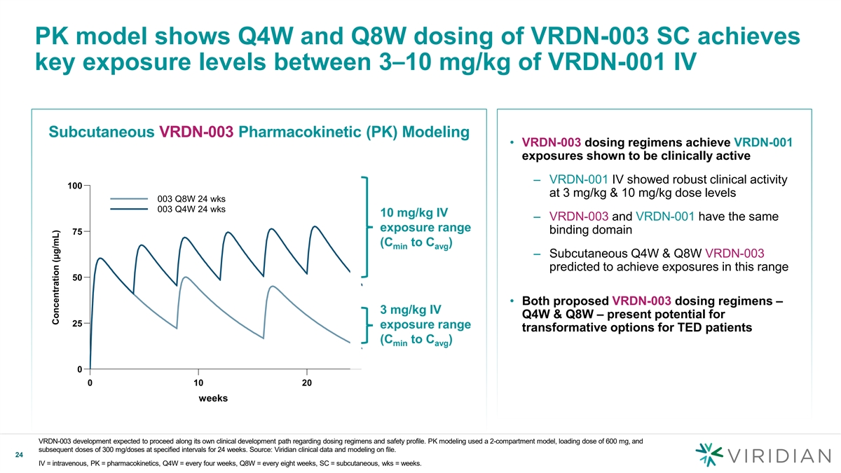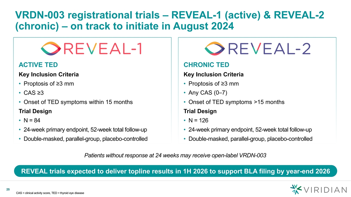PK model shows Q4W and Q8W dosing of VRDN-003 SC achieves key exposure levels between 3–10 mg/kg of VRDN-001 IV Subcutaneous VRDN-003 Pharmacokinetic (PK) Modeling • VRDN-003 dosing regimens achieve VRDN-001 exposures shown to be clinically active – VRDN-001 IV showed robust clinical activity 100 at 3 mg/kg & 10 mg/kg dose levels 003 Q8W 24 wks 003 Q4W 24 wks 10 mg/kg IV – VRDN-003 and VRDN-001 have the same exposure range binding domain 75 (C to C ) min avg – Subcutaneous Q4W & Q8W VRDN-003 predicted to achieve exposures in this range 50 • Both proposed VRDN-003 dosing regimens – 3 mg/kg IV Q4W & Q8W – present potential for 25 exposure range transformative options for TED patients (C to C ) min avg 0 0 10 20 weeks VRDN-003 development expected to proceed along its own clinical development path regarding dosing regimens and safety profile. PK modeling used a 2-compartment model, loading dose of 600 mg, and subsequent doses of 300 mg/doses at specified intervals for 24 weeks. Source: Viridian clinical data and modeling on file. 24 IV = intravenous, PK = pharmacokinetics, Q4W = every four weeks, Q8W = every eight weeks, SC = subcutaneous, wks = weeks. Concentration (μg/mL)