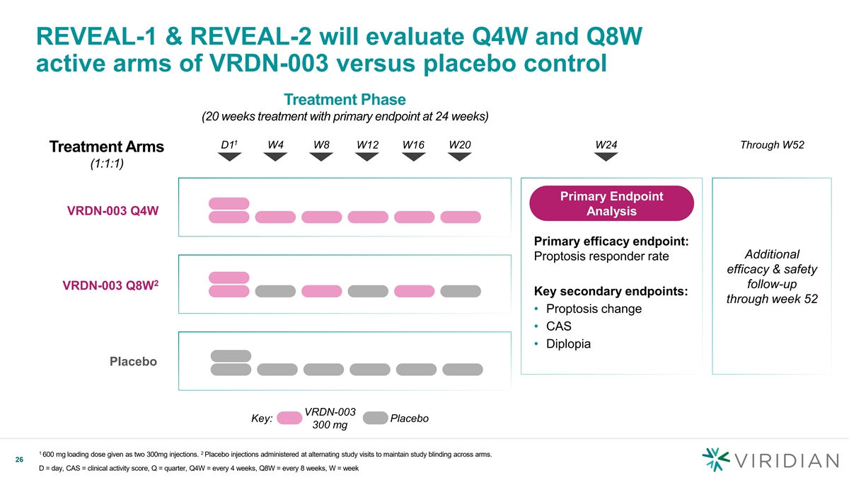 VRDN-003 registrational trials – REVEAL-1 (active) & REVEAL-2 (chronic) – on track to initiate in August 2024 ACTIVE TED CHRONIC TED Key Inclusion Criteria Key Inclusion Criteria • Proptosis of ≥3 mm • Proptosis of ≥3 mm • Any CAS (0–7) • CAS ≥3 • Onset of TED symptoms within 15 months • Onset of TED symptoms >15 months Trial Design Trial Design • N = 84 • N = 126 • 24-week primary endpoint, 52-week total follow-up • 24-week primary endpoint, 52-week total follow-up • Double-masked, parallel-group, placebo-controlled • Double-masked, parallel-group, placebo-controlled Patients without response at 24 weeks may receive open-label VRDN-003 REVEAL trials expected to deliver topline results in 1H 2026 to support BLA filing by year-end 2026 25 CAS = clinical activity score, TED = thyroid eye disease