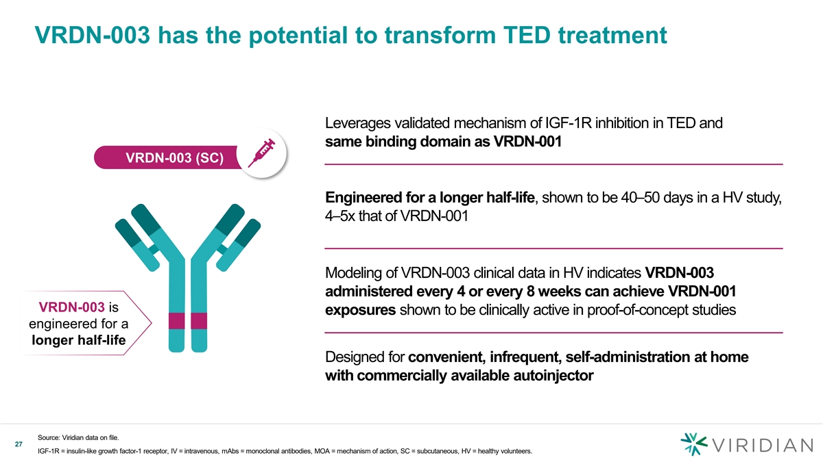 REVEAL-1 & REVEAL-2 will evaluate Q4W and Q8W active arms of VRDN-003 versus placebo control Treatment Phase (20 weeks treatment with primary endpoint at 24 weeks) 1 D1 W4 W8 W12 W16 W20 W24 Through W52 Treatment Arms (1:1:1) Primary Endpoint VRDN-003 Q4W Analysis Primary efficacy endpoint: Additional Proptosis responder rate efficacy & safety 2 follow-up VRDN-003 Q8W Key secondary endpoints: through week 52 • Proptosis change • CAS • Diplopia Placebo VRDN-003 Key: Placebo 300 mg 1 2 600 mg loading dose given as two 300mg injections. Placebo injections administered at alternating study visits to maintain study blinding across arms. 26 D = day, CAS = clinical activity score, Q = quarter, Q4W = every 4 weeks, Q8W = every 8 weeks, W = week